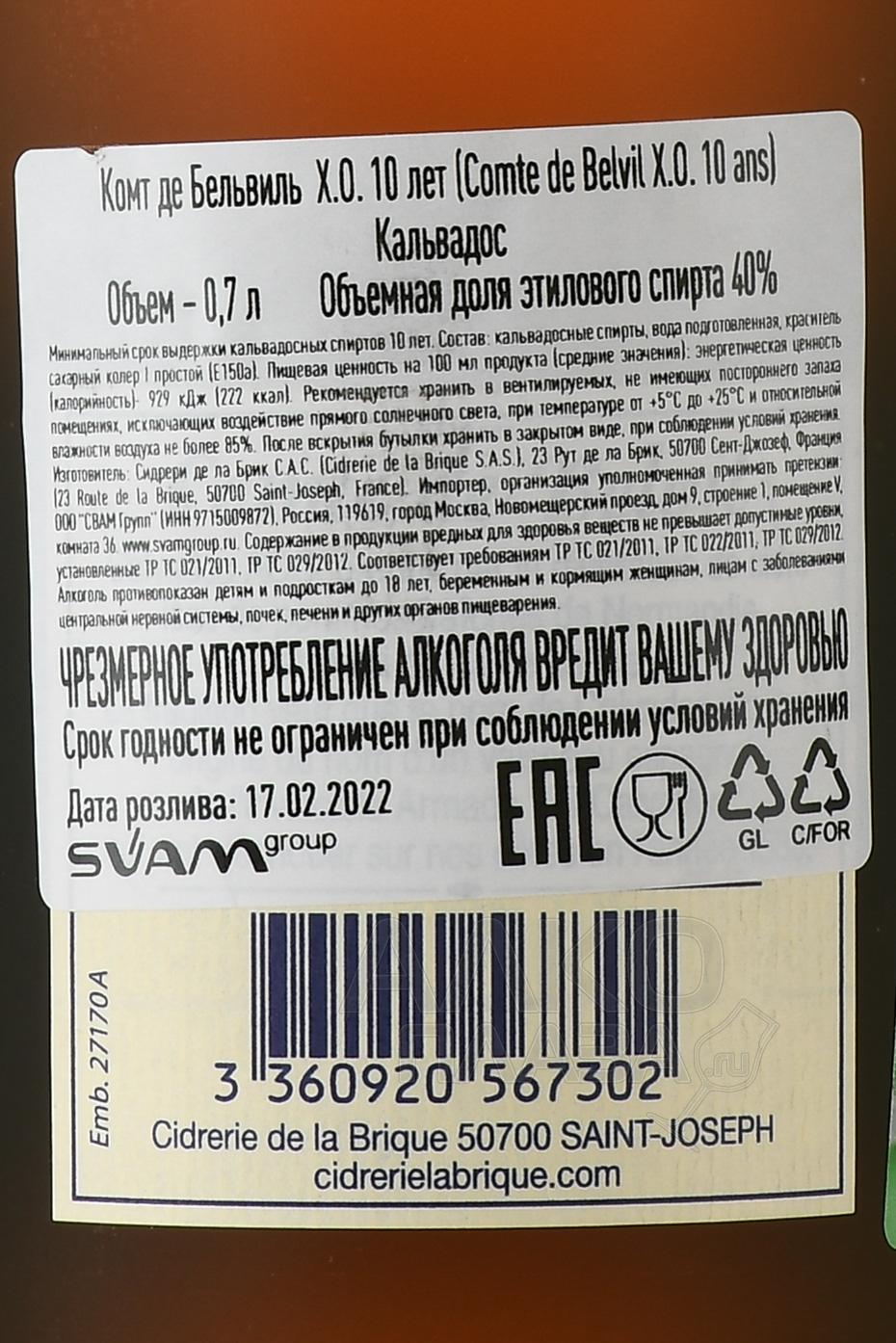 Кальвадос Comt De Belvil XO 10 лет 0,7 л — входит в линейку сортов с солидной выдержкой и открывает ее. Он произведен из собственного сырья компании Cidrerie de la Brique, то есть из свежих яблок особых сортов, выращенных на территории Нормандии. Дистилляция протекала в медных кубах в 2 этапа. Спирты проходили выдержку во французских дубовых бочках не менее 5 лет. Кальвадос бутилировали в феврале 2022 года при уровне крепости 40%.