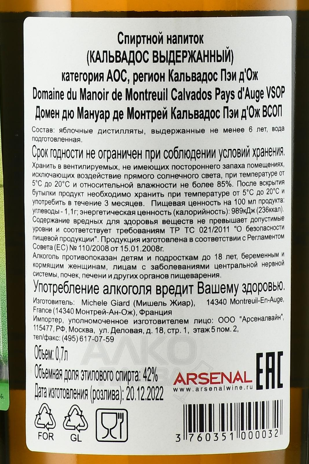 Кальвадос Domaine du Manoir de Montreuil Calvados Pays d`Auge VSOP 0,7 л представлен классическим сочетанием яблок горьких, сладких, горько-сладких и кислых сортов. Сырье собирают в органических садах, принадлежащих винокурне. Собранные по достижении полной спелости плоды перерабатывают в сухой сидр, который затем перегоняют в медных кубах шарантского типа и выдерживают не менее 6 лет в бочках из французского дуба. Для выдержки производитель предпочитает использовать старый дуб, который не перебивает, а только усиливает яркий фруктовый стиль спиртного.