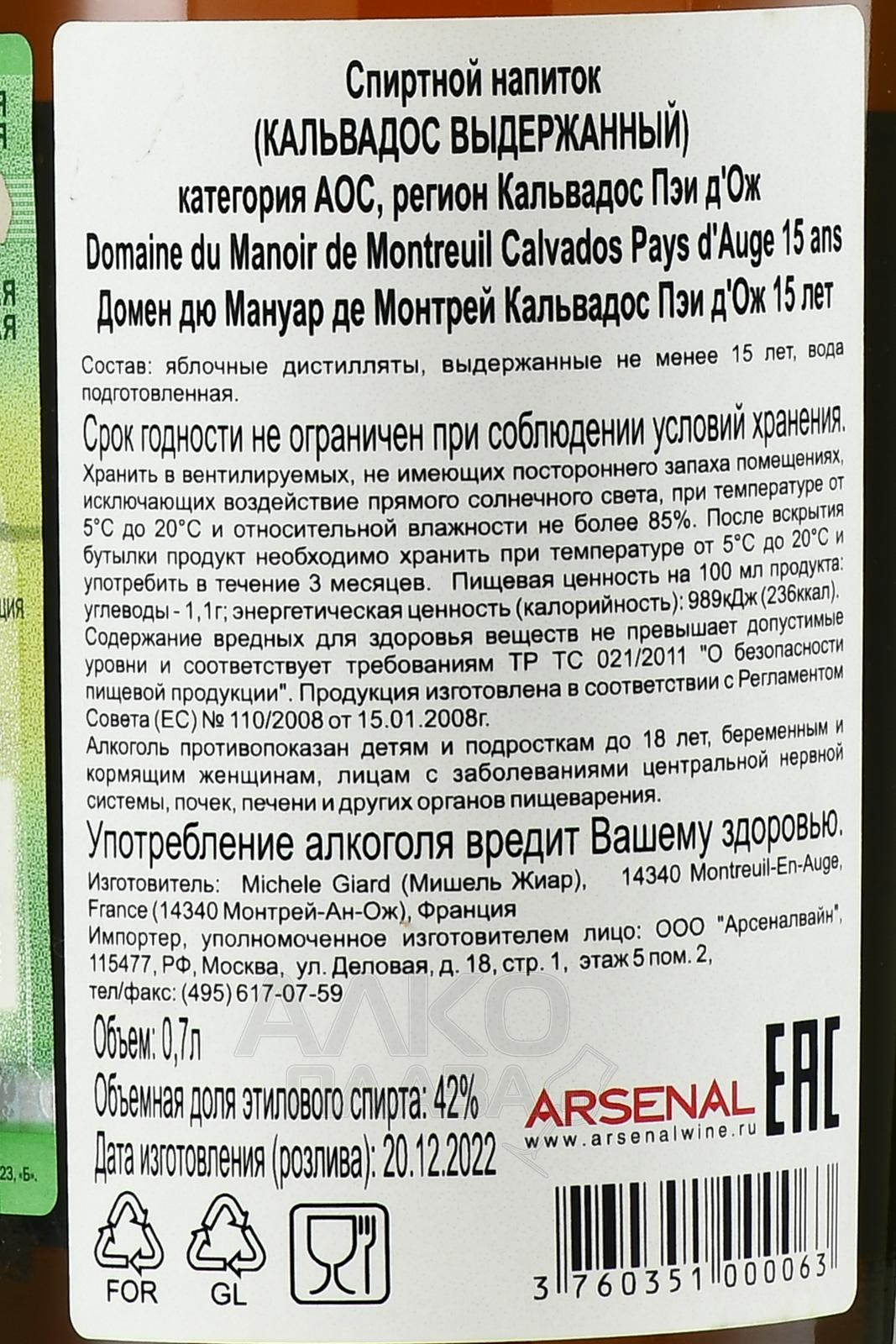 Кальвадос Domaine du Manoir du Montreuil Calvados Pays d’Auge AOC 15 лет 0,7 л — роскошный подарок для ценителя элитного и необычного алкоголя. Традиционный напиток Нормандии изготавливается из яблок старых сортов, выращиваемых в собственных садах производителя Michele Giard в апелласьоне Пэи д`Ож. Деревья посажены на большом расстоянии друг от друга (традиционная агротехника hautes-tiges), дают невысокие урожаи. Плоды не очень сочные, зато ароматные и с высокой концентрацией вкусовых веществ. Из свежеотжатого сока делают сидр, который 12 месяцев хранится в дубовых бочках, далее его дистиллируют в медном кубе (двойная перегонка). Кальвадос не менее 15 лет выдерживался в бочонках из французского дуба, в процессе его постепенно разбавляли мягкой дождевой водой, доводя до итоговой крепости 42%.