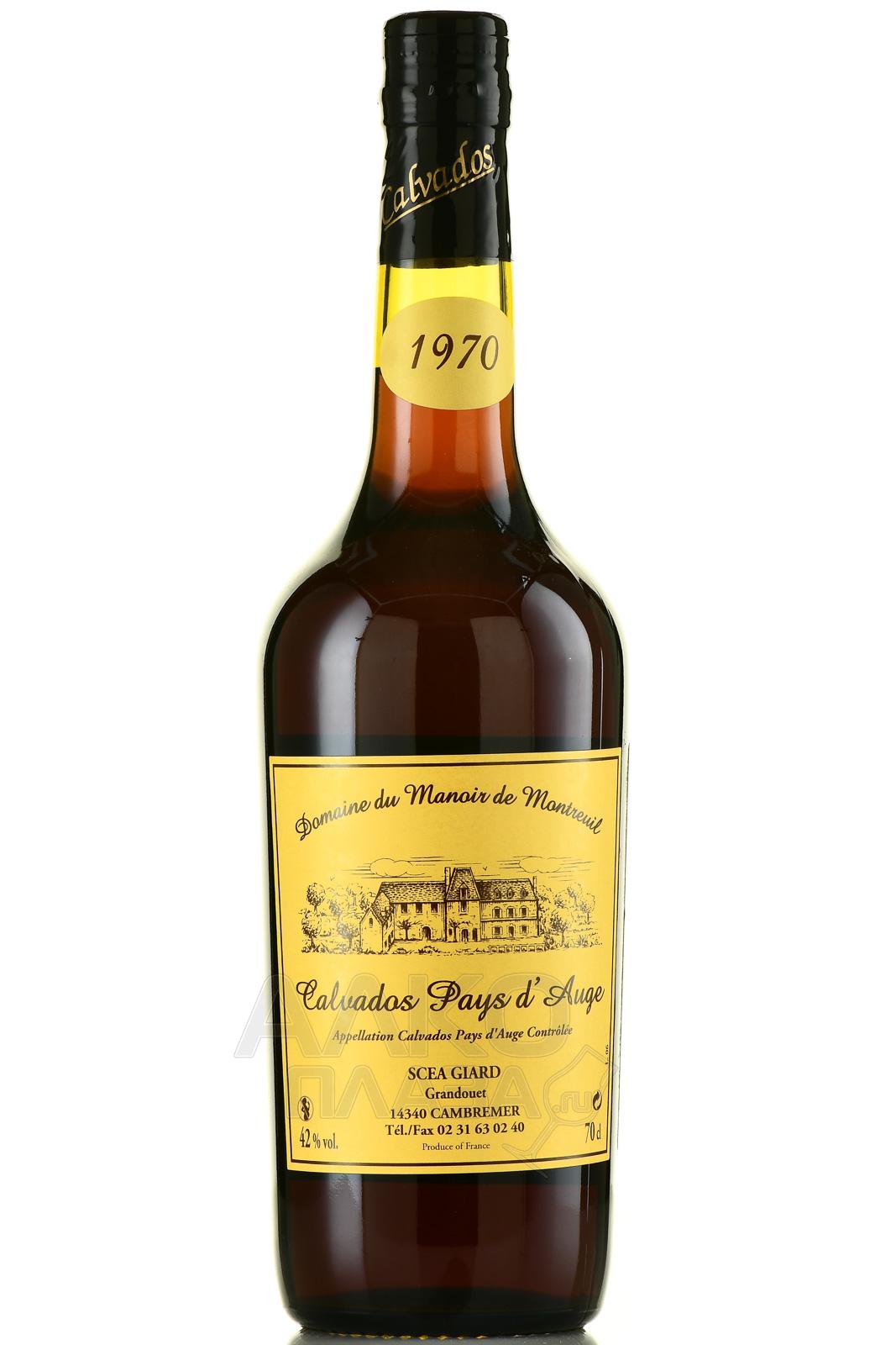 Кальвадос Domaine du Manoir du Montreuil Calvados Pays d’Auge 1970 год 0,7 л — французский популярный крепкий напиток с длинным периодом выдержки в дубе (порядка 52 лет), который контролируют по месту происхождения — региону Нижняя Нормандия, апелласьону Пэи д`Ож. Представленные в составе яблочные дистилляты 1970 года урожая получили из предварительно сброженного сока первого отжима. Затем спирты на много десятилетий налили в бочонки из древесины европейских пород.