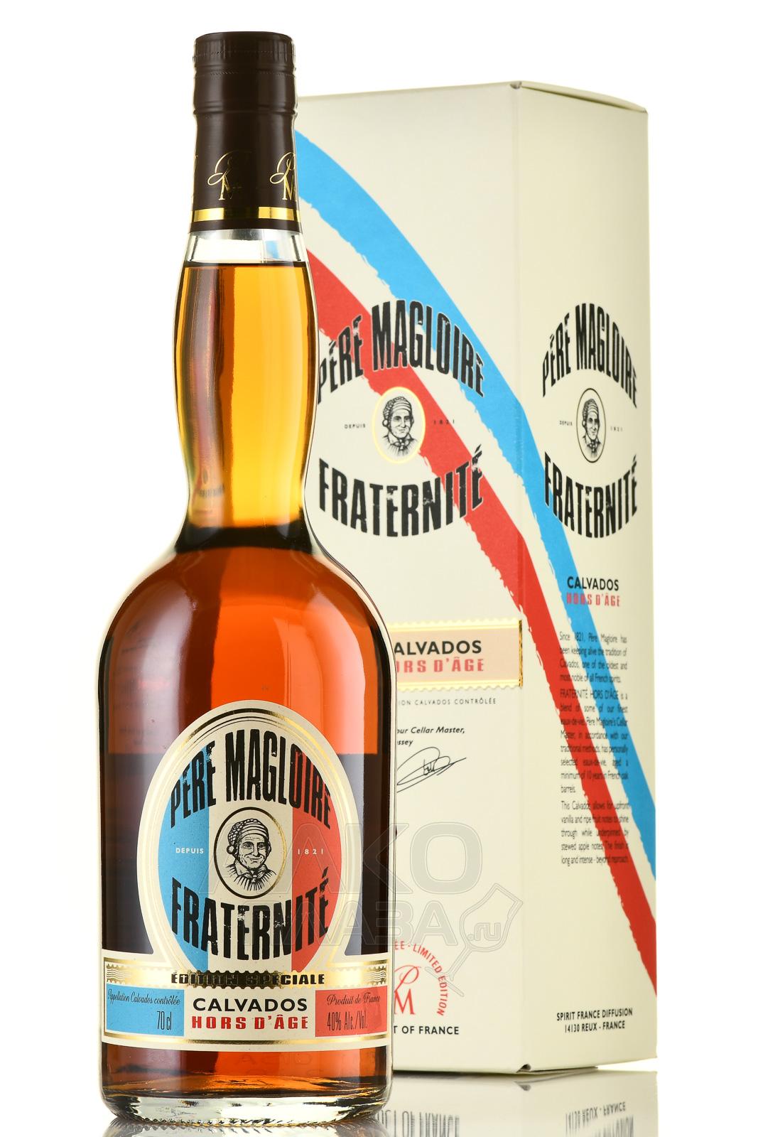 Кальвадос Pere Magloire Fraternite Hors d’Age 0,7 л — качественное спиртное Франции, производимое в регионе Нормандия из спелых яблок местных садов. Фрукты подвергаются отжиму с дальнейшими процессами сбраживания и одного цикла перегонки. Сформировать богатый, сложный дегустационный профиль сорокаградусного элитного напитка защищенного наименования места происхождения позволяет десятилетняя выдержка в дубовых бочонках. Средняя стеклянная бутылка с кальвадосом сопровождается яркой подарочной картонной коробкой, поэтому является завершенным подарочным вариантом.