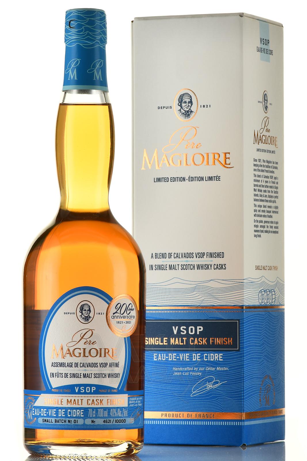 Кальвадос Pere Magloire VSOP Single Malt Cask Finish 0,7 л – лимитированный сорт спиртного, созданный специально к 200-летнему юбилею компании-производителя. В купаж вошли яблочные дистилляты, которые старели не менее 4 лет в бочках из французского дуба, а затем дозревали в емкостях из-под односолодового шотландского скотча. Напиток выпущен партией в 10000 бутылок, каждая из которых имеет индивидуальный порядковый номер и может служить солидным подарком для коллекционеров редкого алкоголя.