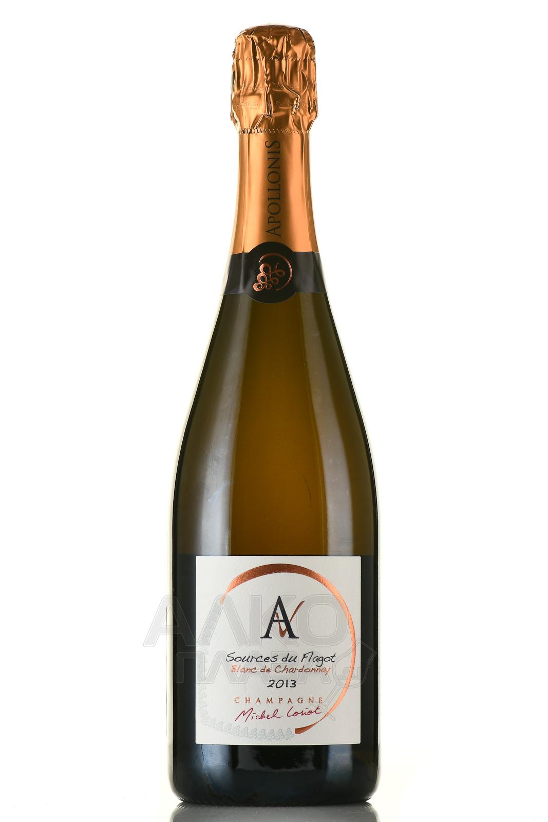Белое сухое шампанское Apollonis Sources du Flagot Blanc de Chardonnay Extra-Brut 0.75 л в п/у — премиальный французский экстра-брют из Шампани в подарочной упаковке, который изготовлен из сорта Шардоне одного года сбора, выращенного на винограднике Флаго департамента Марн. Почвы из известняка и мергеля дарят шампанскому минеральность и идеальную чистоту. Изготавливатся напиток при помощи классической винификации, по окончании которой шампанское выдерживается в подвалах производителя под классическую музыку. Всего выпускается 2500 бутылок.