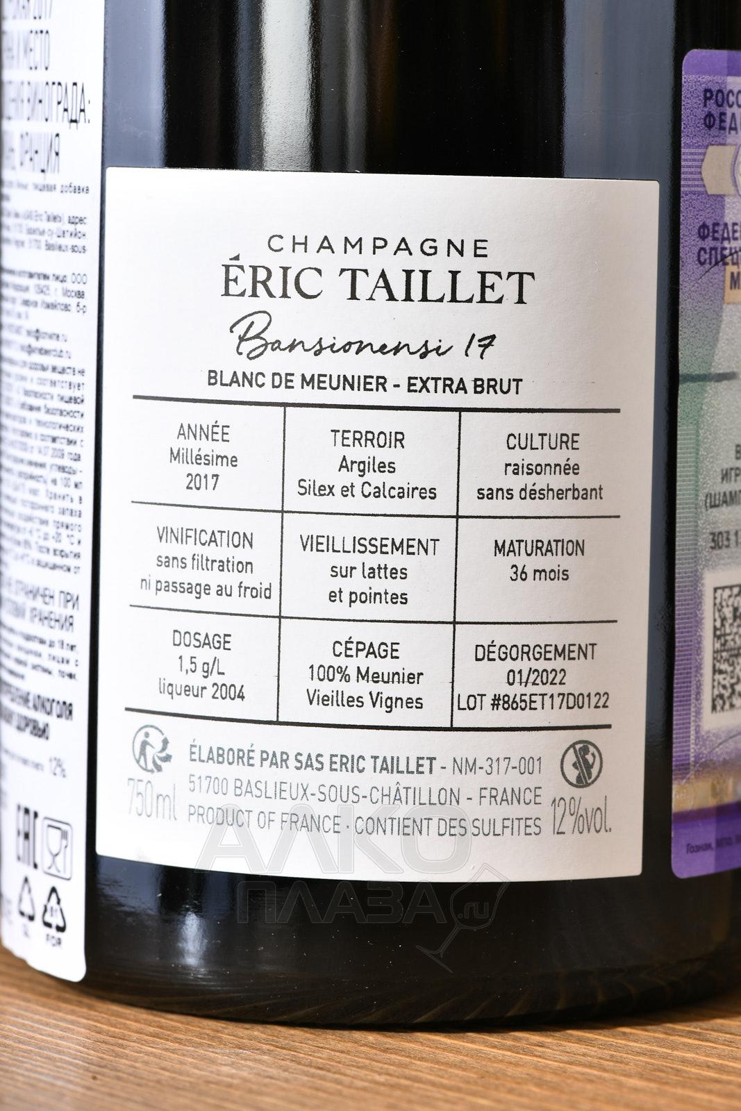 Шампанское Eric Taillet Bansionensi 0,75 л в п/у — белый экстра-брют премиального класса, который станет роскошным подарком по особому поводу. Для производства использовался сорт Менье урожая 2017 года с виноградников Les Pierreuses и La Brusse с глинисто-известняковыми почвами, содержащими дробленый камень. Собранный вручную виноград давят в гидравлическом прессе Dollat мощностью 4000 кг, сусло сбраживают частично в дубовых баррелях, частично в стальных емкостях. Вторичное брожение протекает в бутылках после добавления небольшого количества дозажного ликера (1,5 г/л). Элитный брют выдерживается на тонком осадке 36 месяцев.