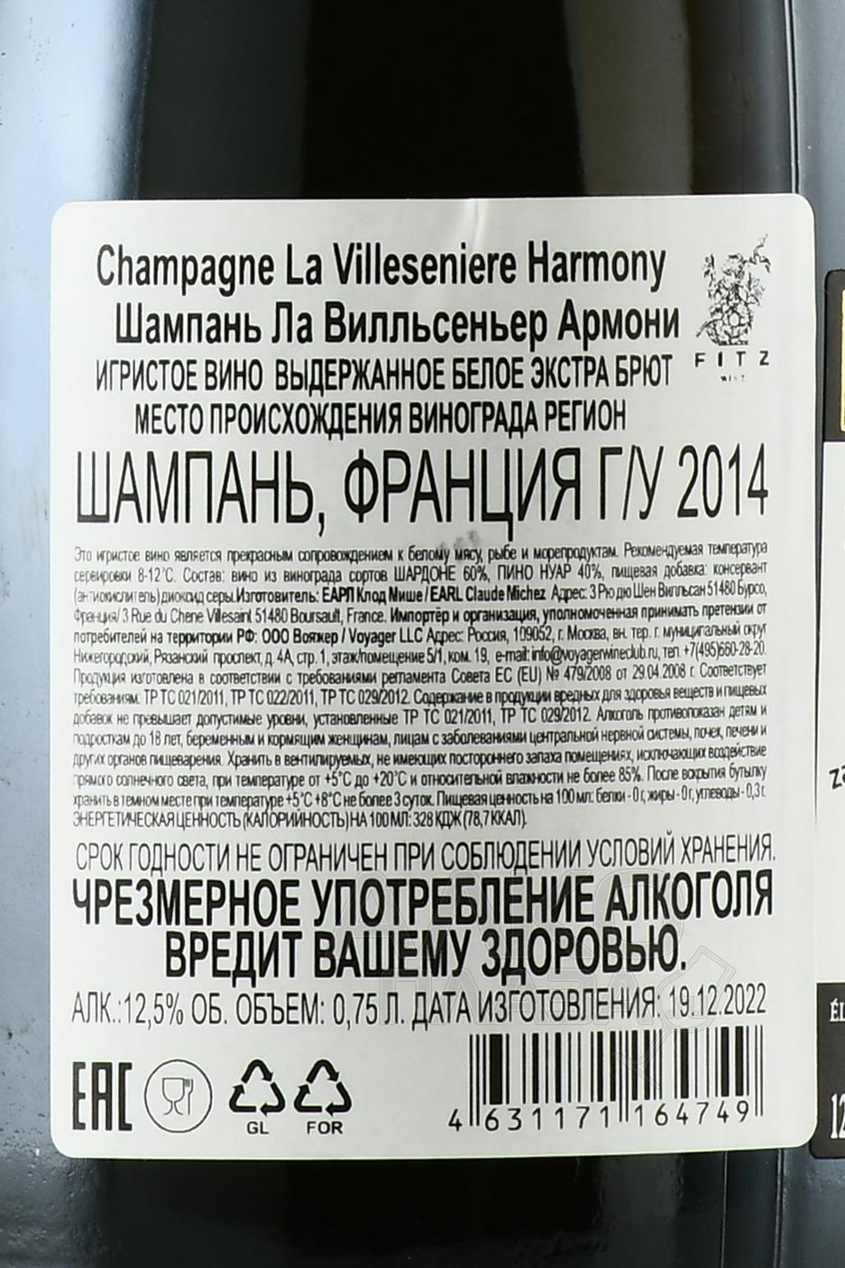 Шампанское белое экстра-брют Champagne La Villeseniere Harmony 2014 г. 0,75 л – купаж из эксклюзивной линейки, каждый образец которой обладает своим неповторимым характером. Урожаи для создания напитка собраны на виноградниках престижной местности Бурсо, где ягоды выращивают с особо трепетным отношением к окружающей природе – в частности, компания не использует инсектициды, а травяной покров может занимать до 90% площади участка. Вино изготовлено с огромным вниманием к каждой детали – это в том числе тщательный выбор плантаций, использование для винификации сока только лучшего качества, выдержка в дубе после первой ферментации. Образец под названием «Гармония» после первичного брожения созревал полгода в бочках, а затем, пройдя шампанизацию, выдерживался на осадке 7 лет. После дегоржажа спиртное отдыхало еще 6 месяцев, а затем была проведена окончательная укупорка. Сложная технология и высокие требования к сырью и готовому продукту обуславливают небольшой тираж, каждый экземпляр которого достоин занять место в частной коллекции дорогого алкоголя.