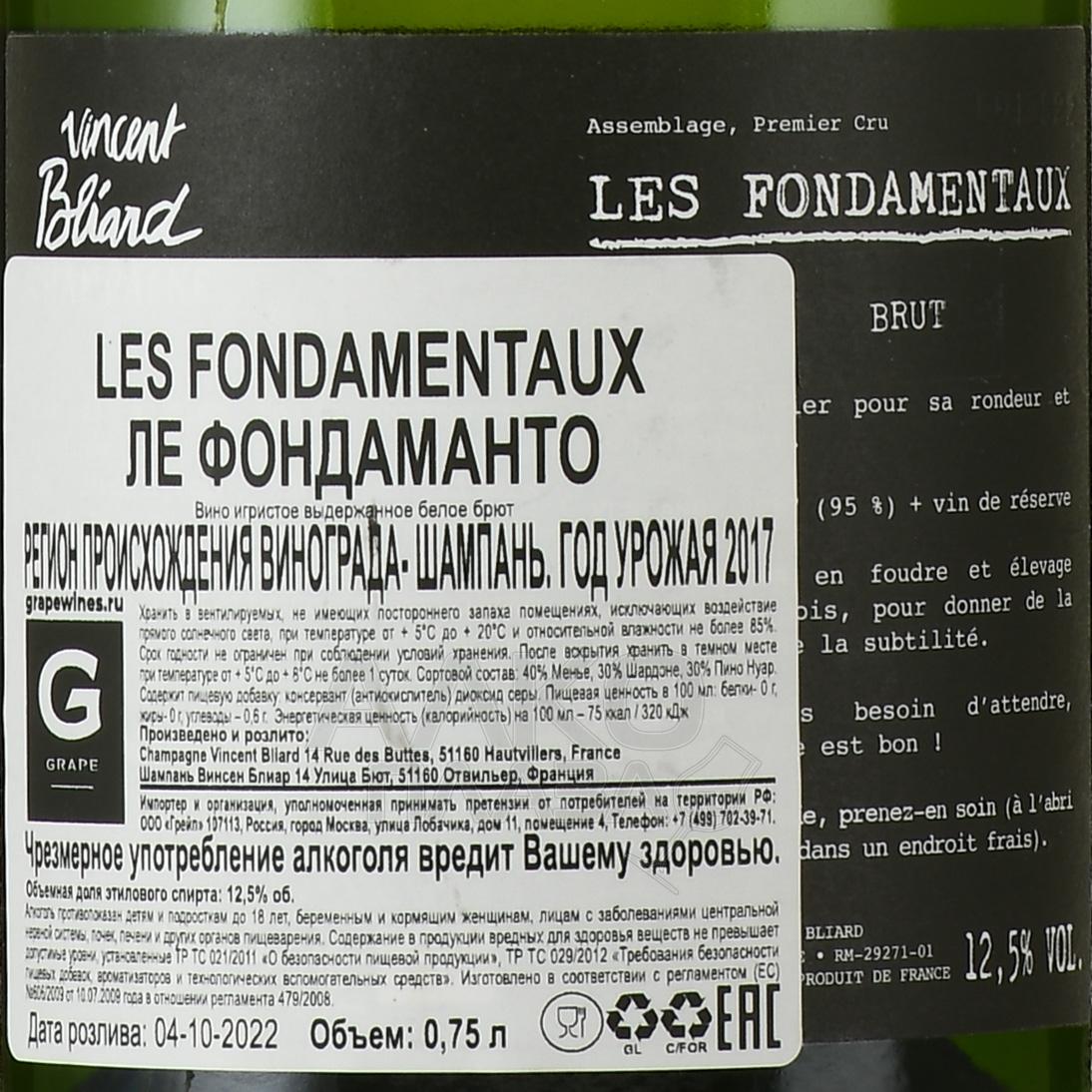 Вино игристое Шампань Ле Фондаманто 0.75 л — премиальный белый французский брют из Шампани, приготовленный из трех сортов винограда Менье, Пино Нуар и Шардоне. Выдерживается игристое вино на осадке в течение одного года в больших дубовых бочках, затем 4 года довыдерживается в бутылках. 95% винограда 2017 года, а всего 5% — это резервные вина прошлых лет. Средний возраст лоз — более 30 лет.