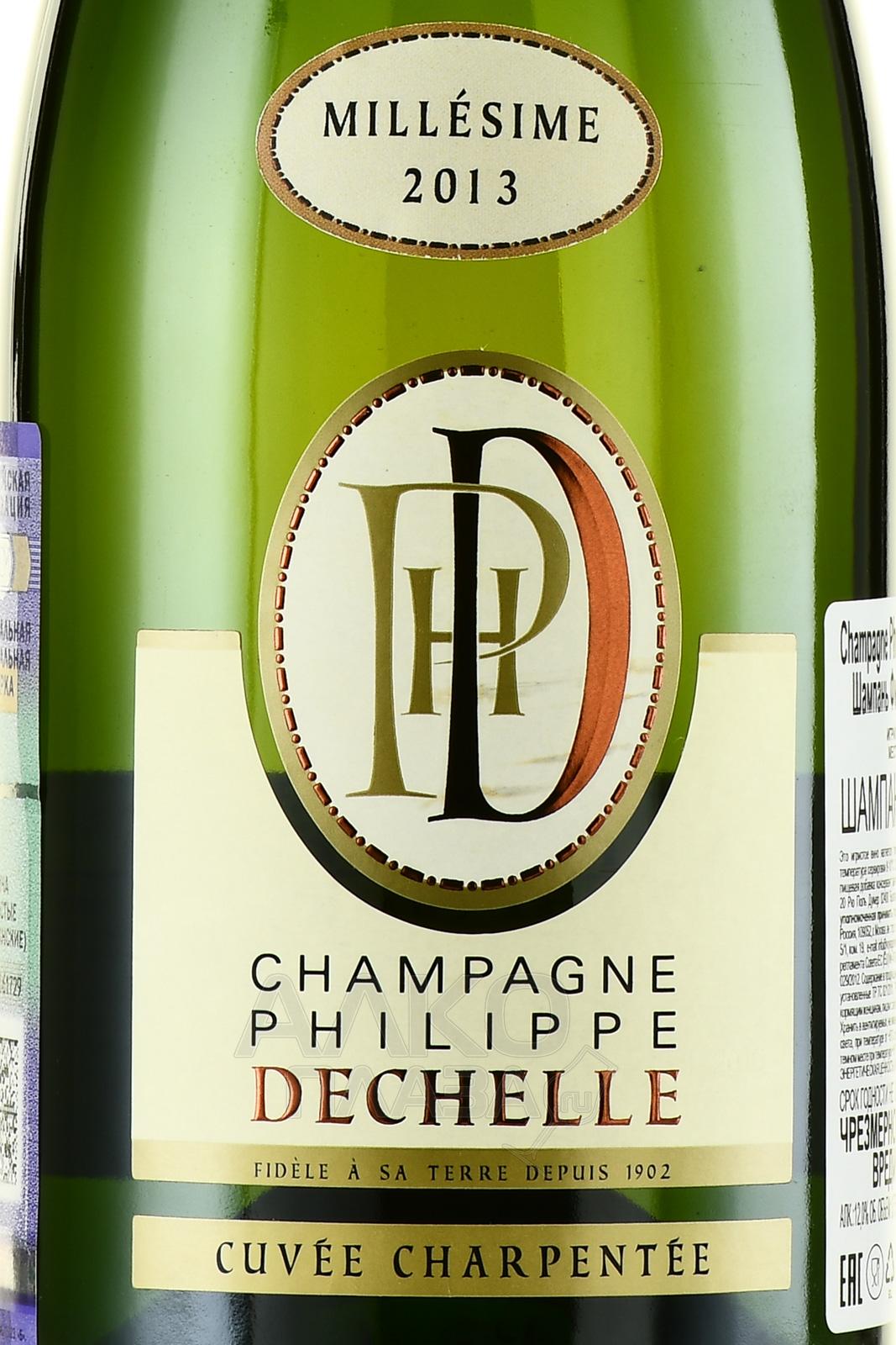 Шампанское белое брют Champagne Philippe Dechelle Cuvee Charpentee 2013 г. 0,75 л – купаж на основе трех классических шампанских сортов винограда. Ягоды собрали вручную в один сезон с плантаций в долине Марны – престижном терруаре региона Шампань. На винификацию пошел сок только первого отжима, что обусловило небольшой объем производства. Первичная ферментация проходила в стальных чанах при низкой контролируемой температуре, вторичная – в бутылках согласно методу шампенуаз. Перед вторым этапом брожения вино созревало в резервуарах из стали на протяжении 8 месяцев. На завершающей стадии бленд выдержали на осадке в течение 5 лет.