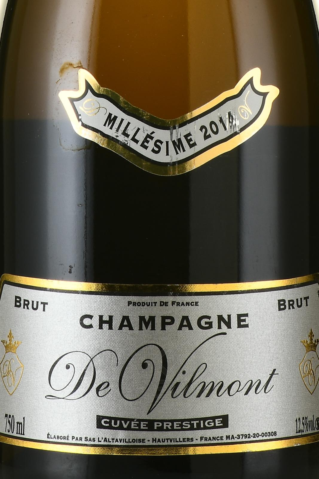 Белое сухое шампанское De Vilmont Cuvee Prestige Brut Millesime 2014 г. 0,75 л — купаж классических сортов красного и белого винограда, собранных немного раньше срока полного созревания на территории Шампани в один урожайный год. Французский алкоголь контролируемого места происхождения ферментировался по методу шампенуаз и выдерживался на осадке до четырех лет. Упаковка бутылки с шампанским — стильная картонная коробка в нежных жемчужно-серебристых тонах.