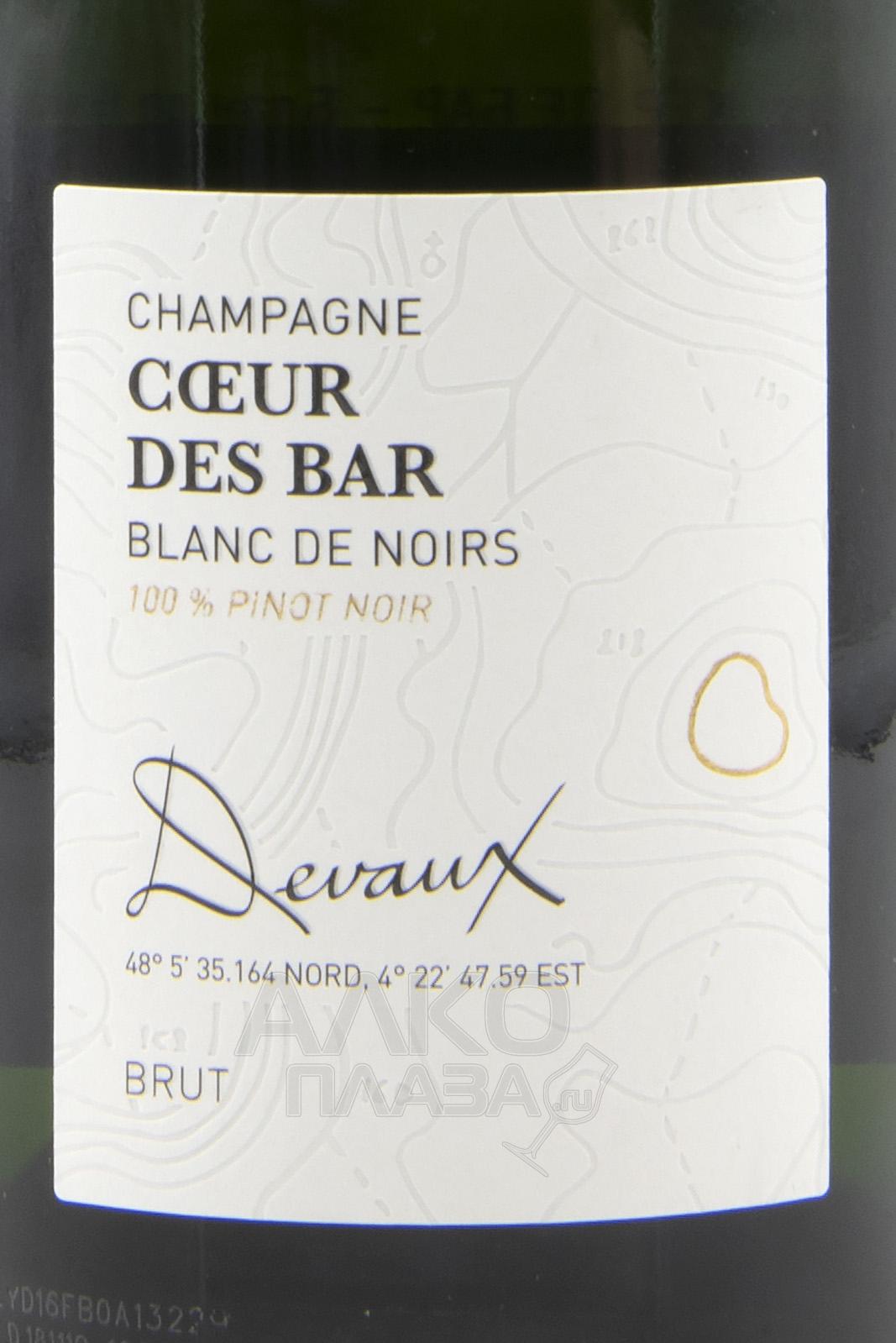 Devaux Coeur des Bar Blanc de Noirs Brut Champagne AOC 0,75 л – белое шампанское из темного винограда Пино Нуар. Урожай для его производства был собран с отдельных участков субрегиона Кот де Бар в провинции Шампань. Ферментация сусла длится в течение 6-8 недель, а созревание вина продолжается не менее трех лет. После добавления дозажного ликера напиток отдыхает в бутылке еще на протяжении 3 месяцев.