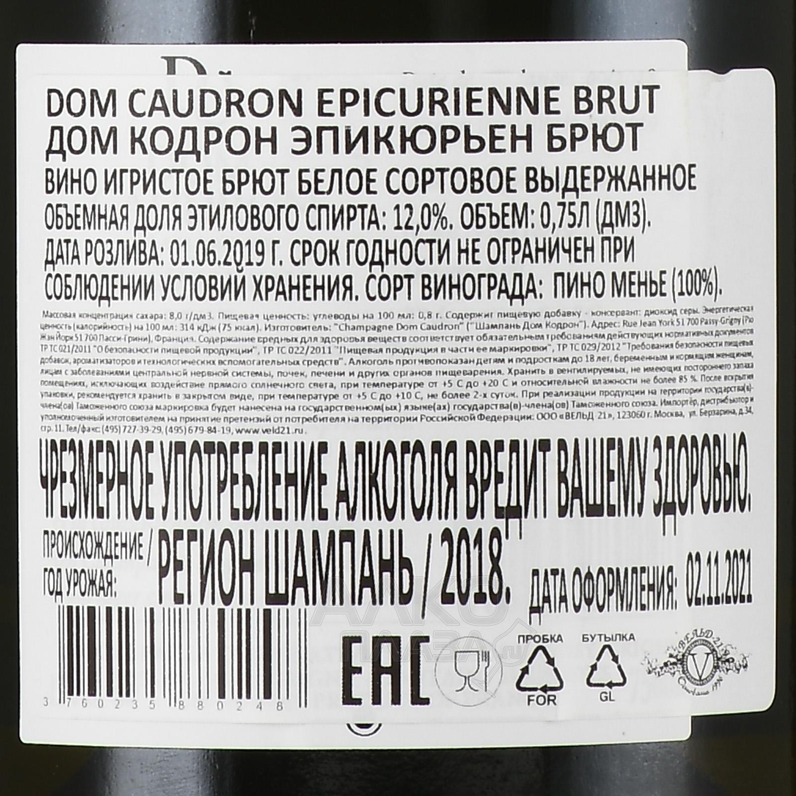 Белое сухое шампанское Dom Caudron Epicurienne Brut Champagne 2018 г. изготовили в местечке Пасси-Гриньи на территории области Долина Марны (Франция, Шампань), а сырьем послужил красный виноград с местных лоз возрастом около 50 лет. Его собрали вручную на плантациях, где преобладают глинистые почвы с отложениями известняка и песчаных пород. Спрессованные ягоды винифицировались при постоянно поддерживаемой температуре — сначала в емкостях из нержавеющей стали, затем в бутылках. Также применялся этап выдержки на тонком осадке. Шампанское крепостью 12% содержит дозажный ликер в объеме 9 г/л.