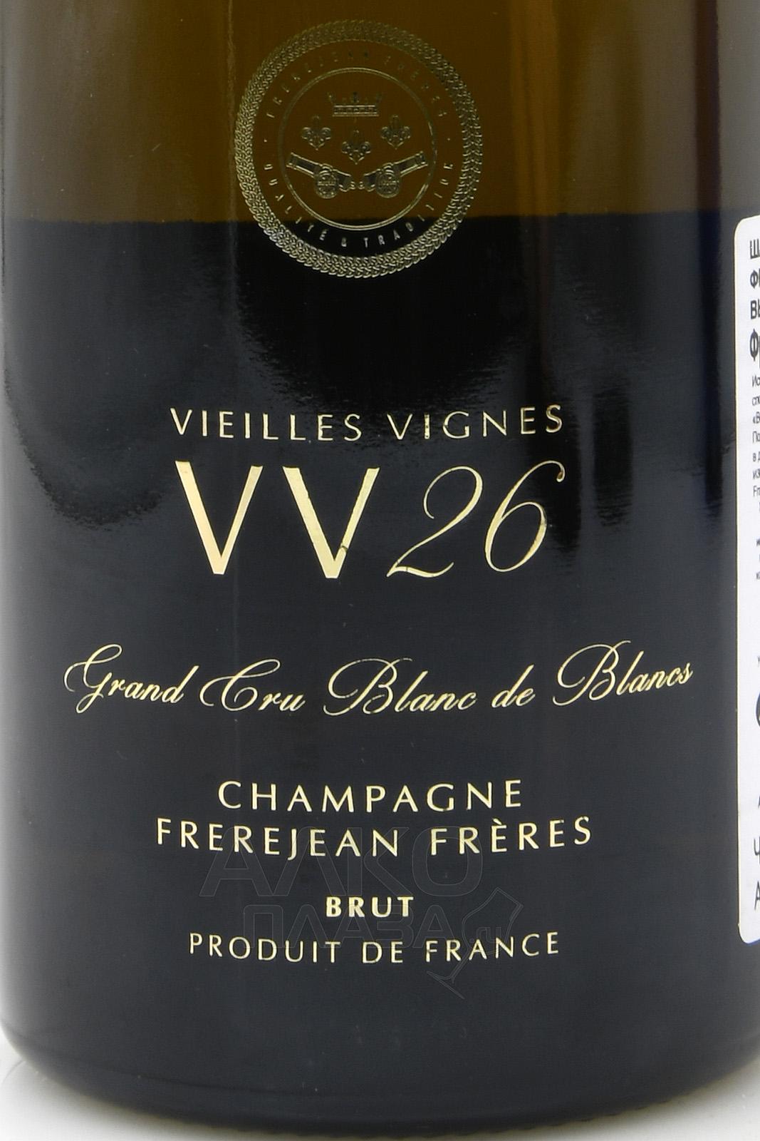 Шампанское Frerejean Freres VV26 0,75 л — белый премиальный брют, который был выпущен ограниченным тиражом. Для производства использовался один светлый сорт, поступающий с нескольких элитных участков Кот-де-Блан. Возраст лоз достигает 90 лет. Кюве выдерживают в дубовых бочках 7 месяцев, а затем смешивают с винтажами более ранних годов. Производство игристого вина базируется на традиционной технологии шампенуаз. Это шампанское получило высшие оценки от критиков и несколько престижных наград.