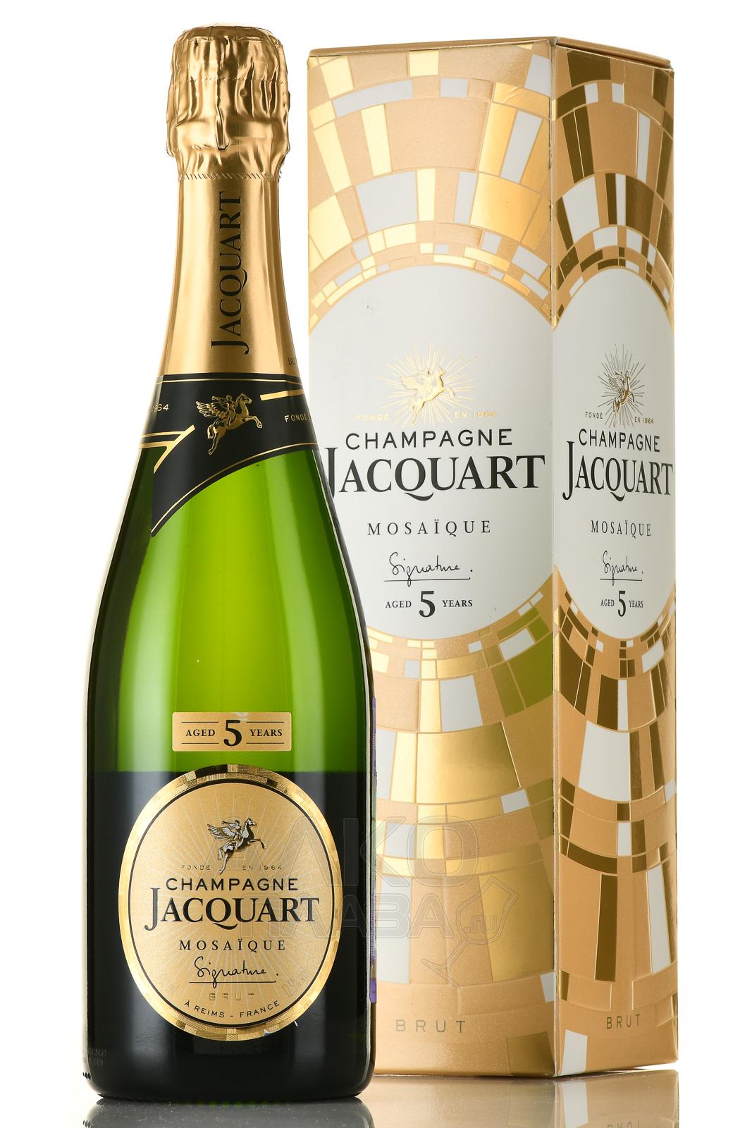 Белое сухое шампанское Жакарт Брют Мозаик Сигнятюр 0,75 л – 12-градусный купажированный напиток, изготовленный из трех аборигенных сортов винограда, выращенных на плодородных почвах северо-востока Франции, на виноградниках винных домов Шампани. Сочные плоды, собранные на пике зрелости, тщательно собирают и сортируют, после чего сырье проходит брожение в резервуарах с регулируемым температурным режимом, а выдерживают шампанское на протяжении трех лет, далее изысканный брют разливается по лаконичным бутылкам.