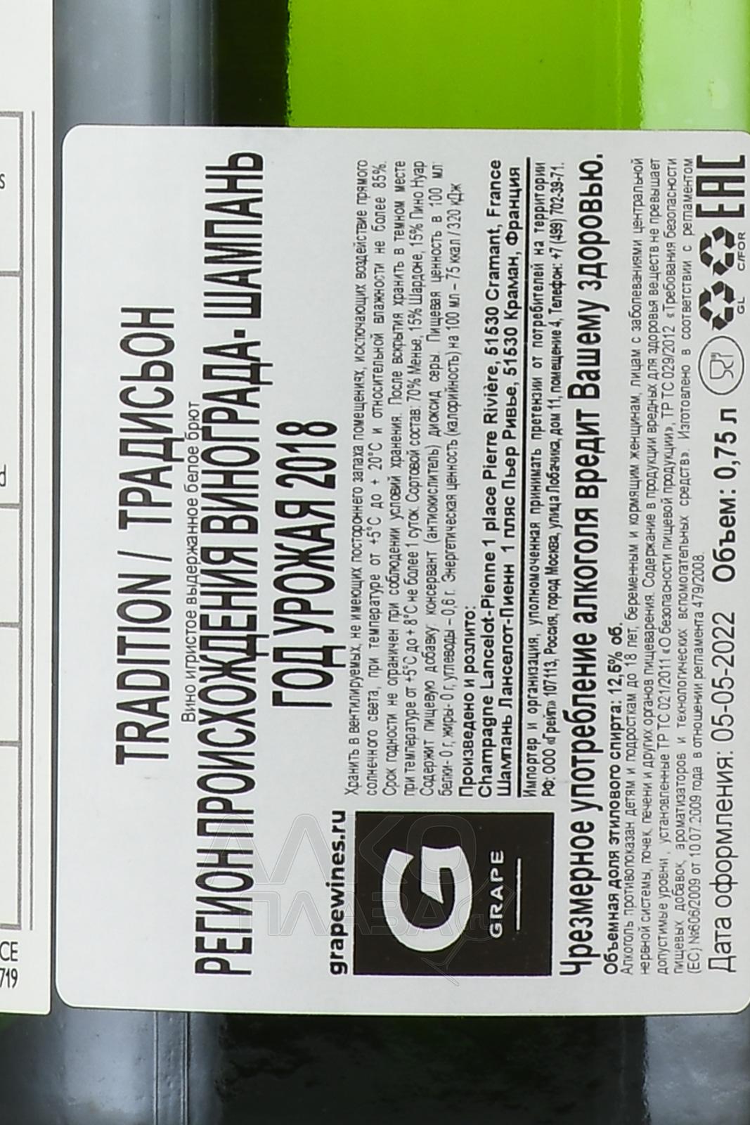 Вино игристое белое Champagne Lancelot-Pienne Tradition 2019 г. 0,75 л – традиционный брют, созданный на основе купажа французских сортов винограда. На винификацию пошли ягоды, созревшие на южных склонах Валле-де-ла-Марн и Эперне. Лозы одного года, с которых собрали урожай, достигли в среднем 40-летнего возраста. Виноградный сок ферментировался при 18-20 °C в стальных чанах, после его подвергли яблочно-молочному брожению и выдержке на осадке в стекле. В бутылках будущее щампанское провело не менее 48 месяцев. Для обогащения вкусоароматического профиля в состав напитка добавили дозажный ликер с содержанием сахара 6 г/л и немного резервного вина, хранящегося в погребах винодельни.