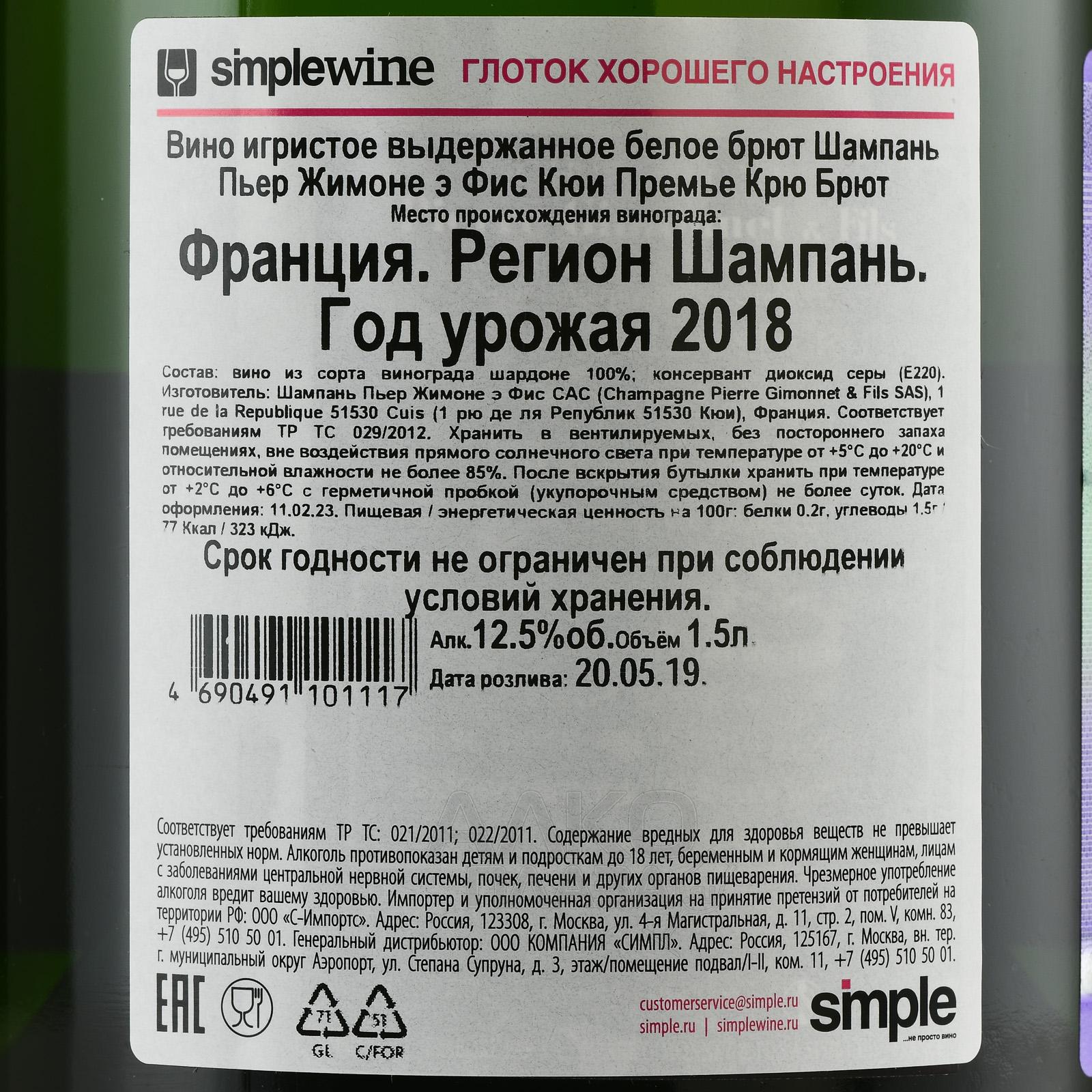 Белое сухое шампанское Pierre Gimonnet & Fils Cuis 1er Cru Brut 2018 г. 0,75 — люксовый напиток Франции, изготовленный из винограда ограниченной области региона Шампань, которая классифицируется как Премьер Крю. Это моносепажная версия, состоящая виз винограда светлого сорта, сорванного в определенный урожайный сезон с сорокалетних лоз и более старых растений. Шампанское ферментировалось в металлических баках и бутылках, а также выдерживалось на осадке. Формат упаковки — бутылка повышенного объема в паре с черным подарочным боксом прямоугольной формы.