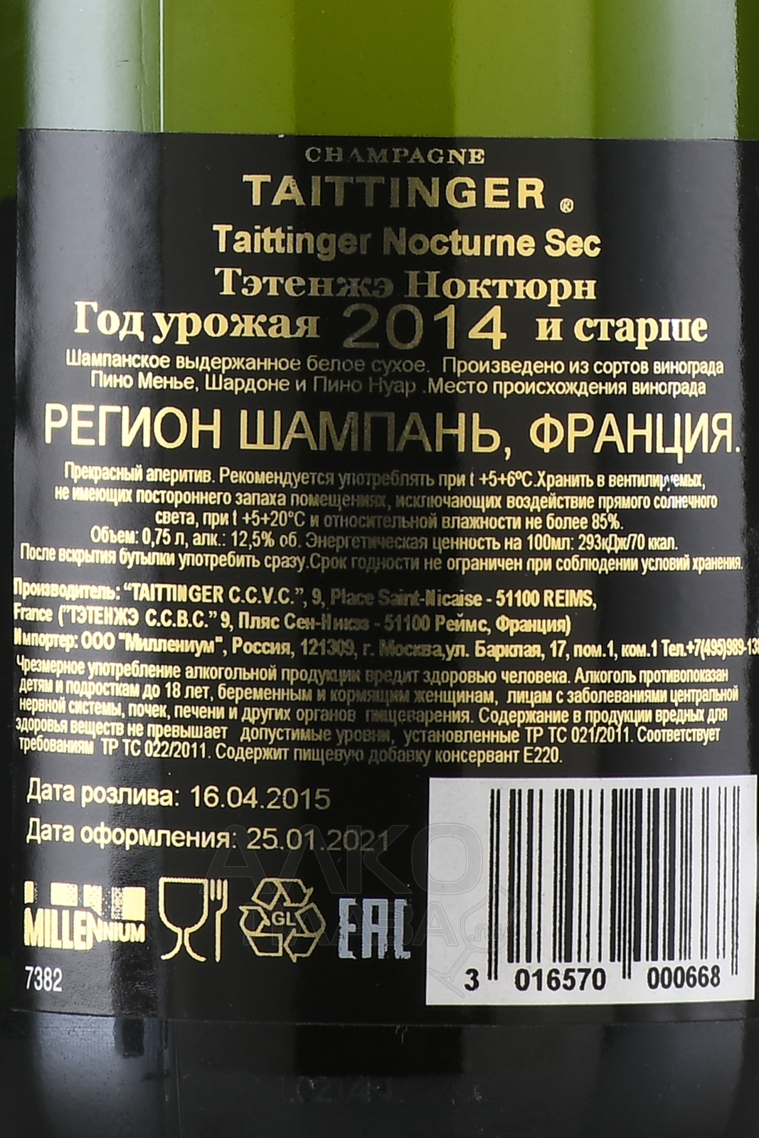 "Nocturne" — исключительное шампанское, купаж которого включает в себя более урожай с 35 разных Крю прекрасной степени зрелости. Шампанское выдерживается на осадке как минимум 4 года. Дозировка тростникового сахара на литр составляет 18 грамм. Эта доза, в два раза превышающая содержание сахара в Taittinger Brut Reserve, в сочетании с округлостью и зрелостью купажа придает шампанскому совершенную структуру и гладкость, что делает "Nocturne" незабываемым напитком для любого торжественного события, семейного ужина или дружеской вечеринки.