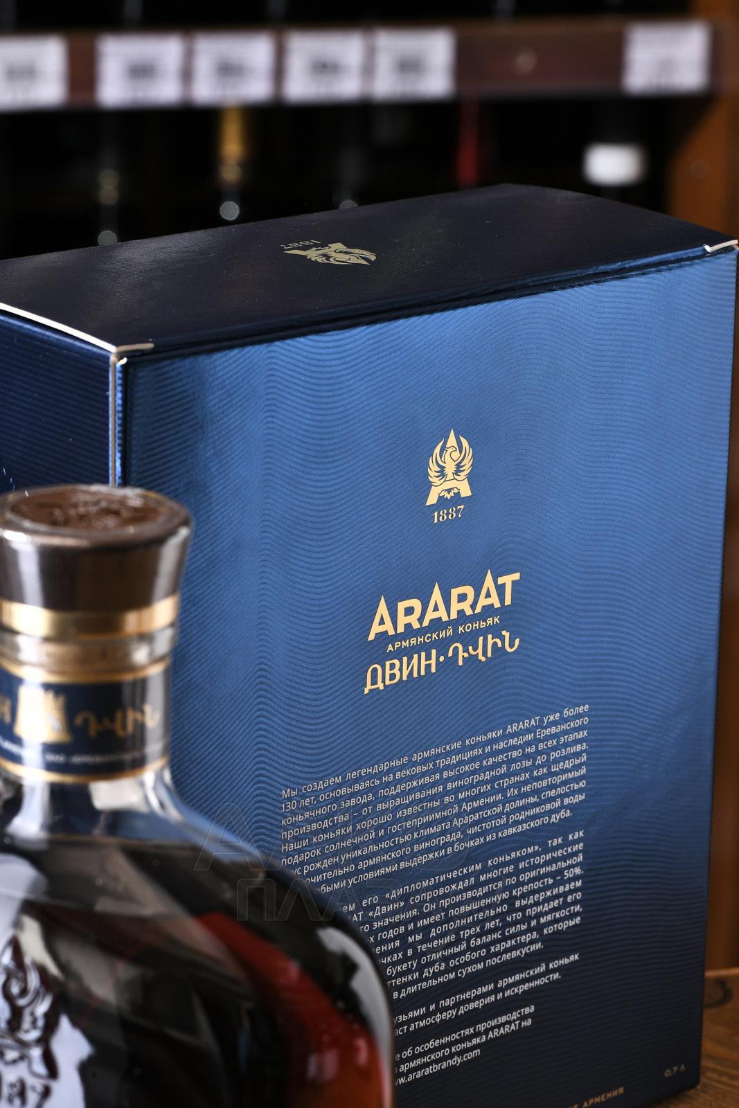 Коньяк Арарат Двин 0,7 л обладает повышенным градусом (50 процентов), который умеренно проявляется при дегустации благодаря высочайшему качеству составляющих напитка — виноградных спиртов, полученных из ягод белых сортов автохтонной группы. Напиток с десятилетним сроком выдержки в дубе изготовили по стандартному алгоритму без добавления консервантов. Упаковкой выступил симпатичный графин из прозрачного стекла, помещенный в сувенирную коробку стильного вида.