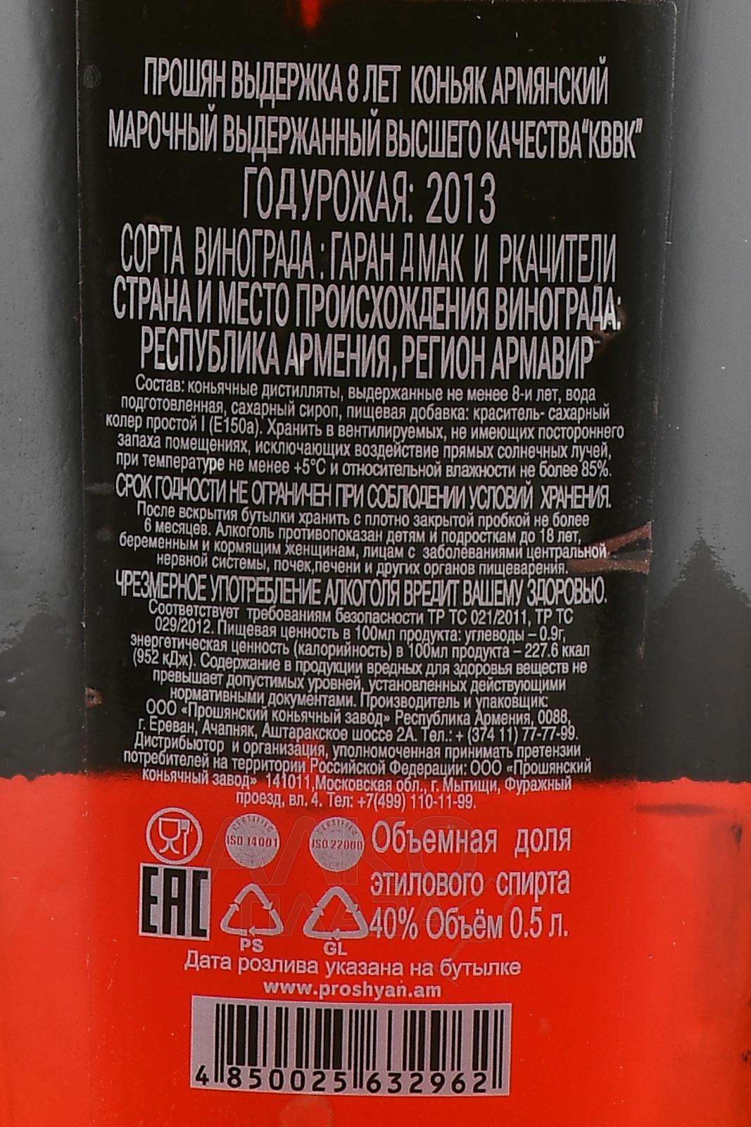 Коньяк Прошян ХО 8 лет предлагается в сувенирной таре — презентабельной бутылке 500 мл с украшенной объемными золотыми элементами крышкой. Армянский алкоголь крепостью 40 градусов состоит из смеси премиальных виноградных дистиллятов разного возраста (минимум 8 лет). Выдержка прошла в барриках из древесины кавказского дуба.