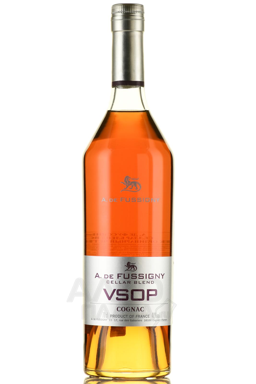 Коньяк A. de Fussigny Cellar Blend VSOP 0,7 л — четырехлетний алкоголь производства Франции, относящийся к типу крепкого спиртного защищенного наименования места происхождения. Он обладает крепостью 40 градусов и традиционным составом из белого винограда местности Гран Шампань (регион Коньяк), обработанного по законодательно установленному алгоритму. Обязательной стадией изготовления стала выдержка в барриках на базе древесины французского дуба.