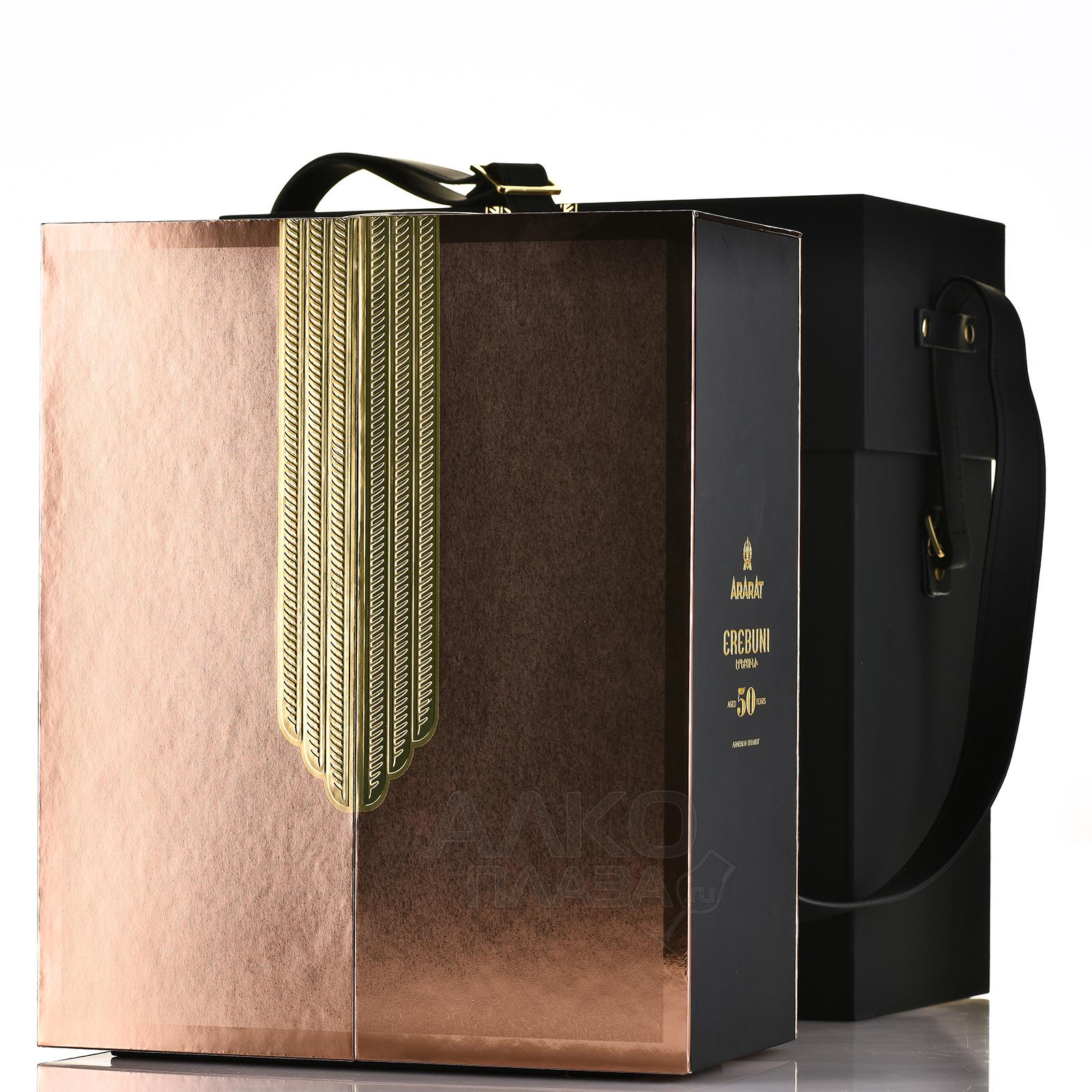 Коньяк Ararat Erebuni 50 лет 0,75 л в п/у — легендарный, ультра-премиальный, по-настоящему уникальный, настоящее сокровище Ереванского коньячного завода. Алкоголь, названный в честь символа процветания Армении — древней крепости Эребуни, достоин занять ведущее место в коллекции ценителя. Такой роскошный презент подчеркнет значимость торжественного события, статус и безупречный вкус дарителя. Коньяк создан из лучших, редких дистиллятов, хранившихся в подвалах завода. Самые молодые имеют возраст 18 лет, старые — 104 года. Средний возраст — 50 лет. Уникальный купаж с филигранным, богатым вкусом стал новой главой в 130-летней истории армянской коньячной промышленности. Он представлен в декантере ручной работы, дизайн которого создал прославленный мастер Филипп Сэ. По его словам, в оформлении с использованием золотых деталей и оттенка черного обсидиана он стремился отразить аутентичные черты Армении: яркое солнце, плодородную землю, уникальность природы и культуры.