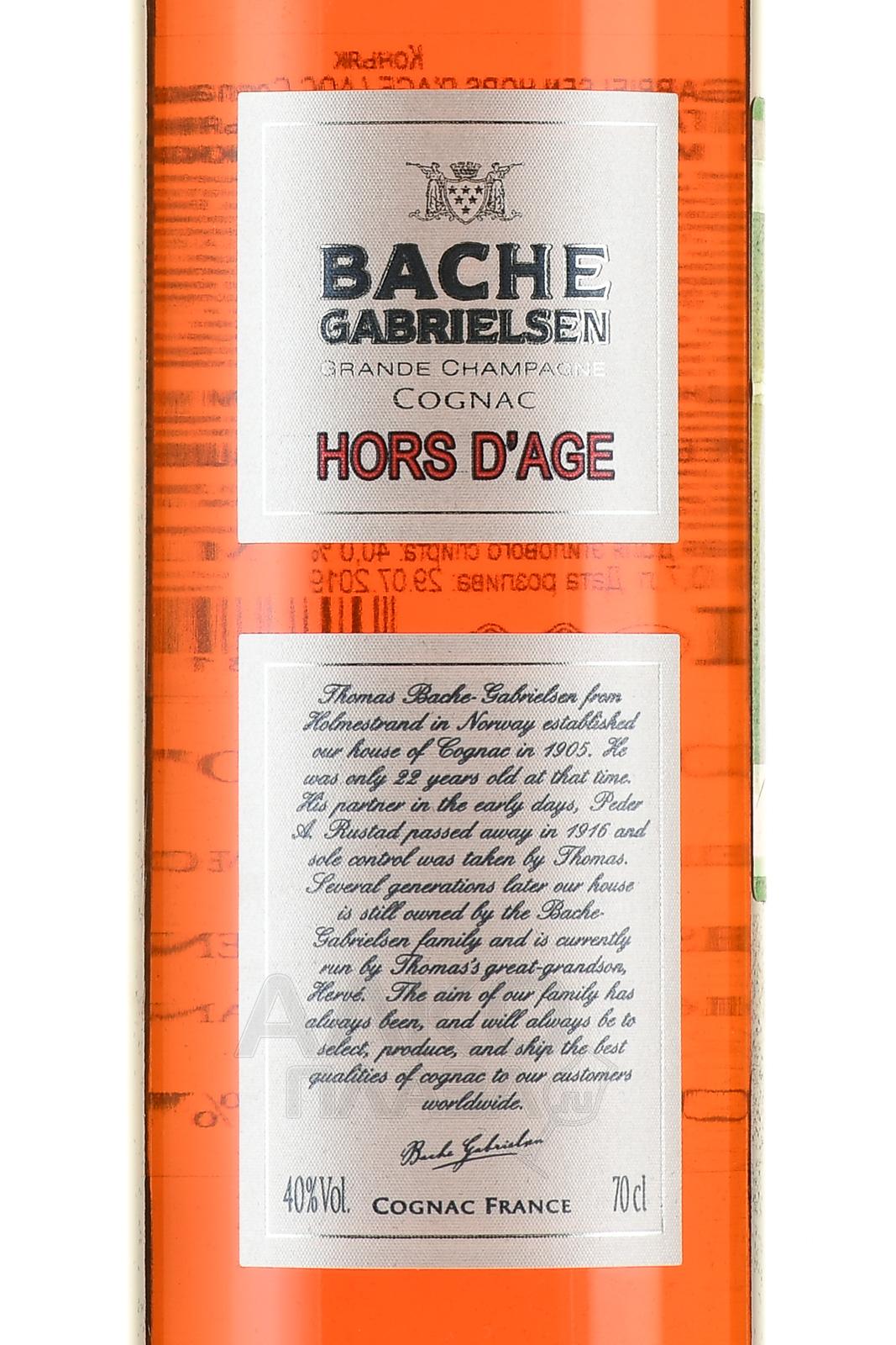 Коньяк Bache-Gabrielsen Hors d`Age Grande Champagne 0,7 л — уникальный французский напиток с большим сроком выдержки (порядка 50 лет), который был выпущен в ассортименте легендарного семейного дома. При изготовлении сорокапроцентного алкоголя применялся виноград двух автохтонных сортов области Cognac, апелласьона Гран Шампань, обработанный путем сбраживания, перегонки и вызревания в лимузенских дубовых бочках. Стильная бутылка с коньяком идет в паре с солидным деревянным боксом.