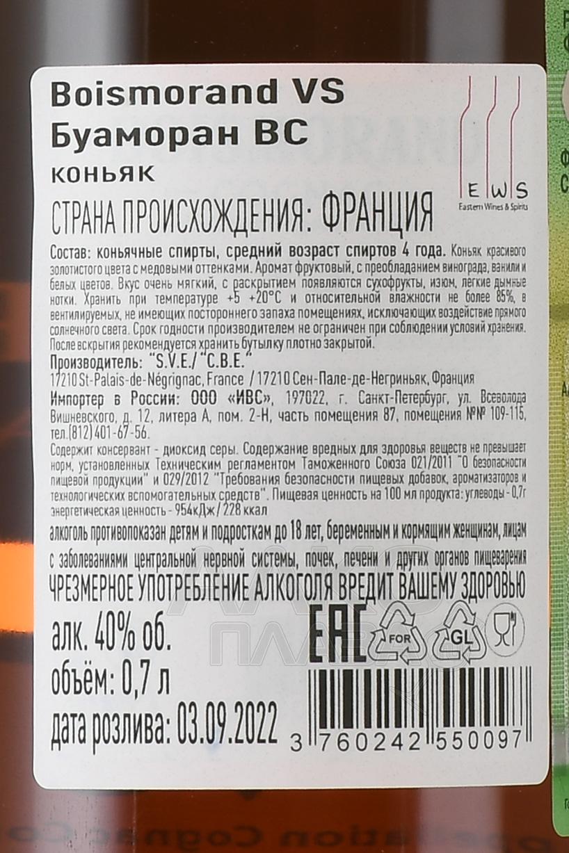 Коньяк Boismorand VS 0,7 л производится французской дистиллерией SVE семейного типа, которая использует традиционные технологии, собственные наработки и современные ноу-хау. Она находится в самом сердце провинции Коньяк и владеет здесь собственными виноградниками с классическими сортами. Также сырье частично закупается у хозяйств из разных апелласьонов региона Cognac. После двойной перегонки следует этап длительной выдержки спиртов в дубовых бочках. Самые молодые дистилляты в купаже — 4-летние.