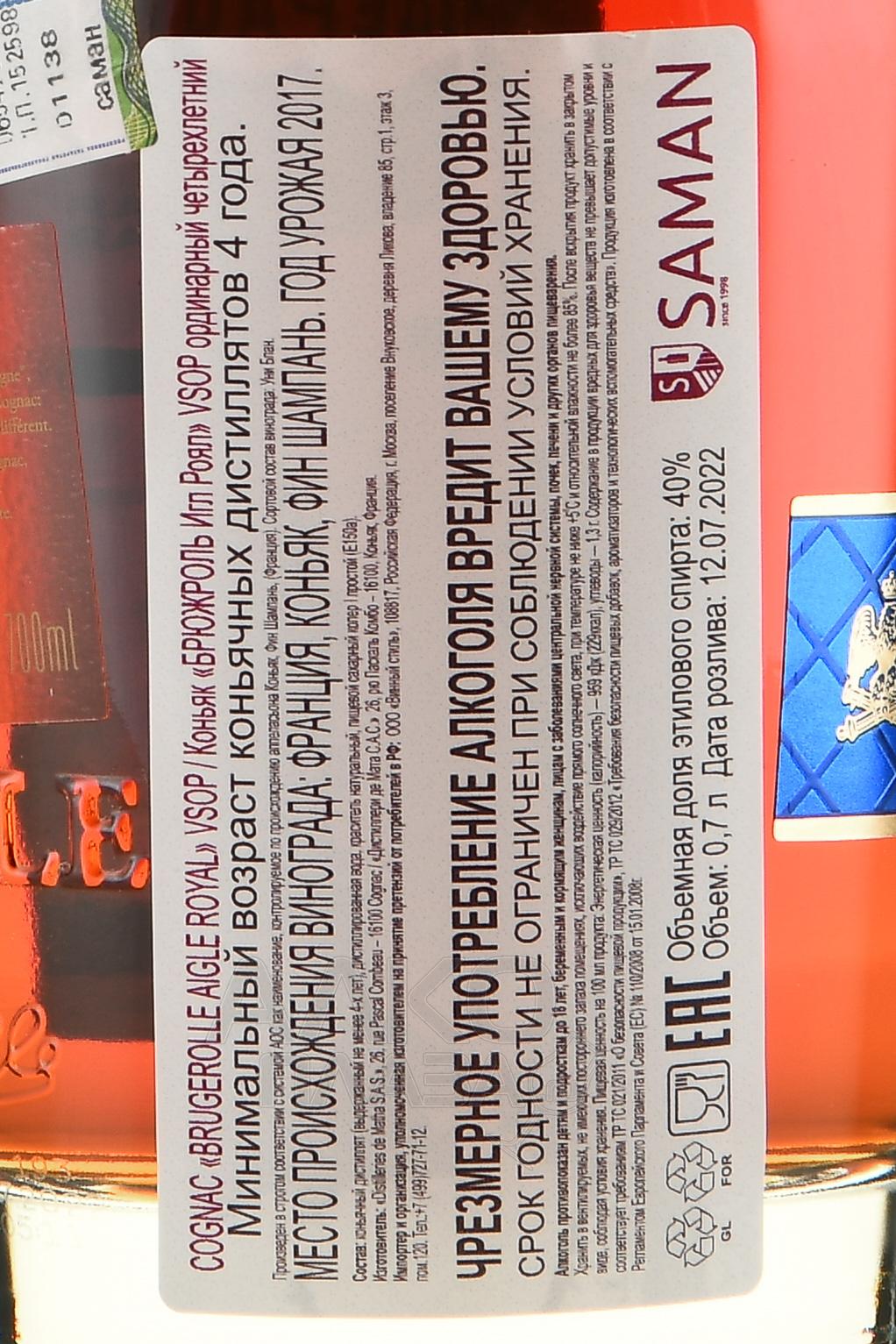 Коньяк Brugerolle Aigle Royal VSOP 0,7 л — сорокаградусный французский алкоголь с защищенным наименованием места происхождения, представляющий собой смесь лучших дистиллятов автохтонного винограда с угодий местности Cognac. Вариацию создали из сырья областей Гран и Пти Шампань с использованием этапов сбраживания, двойной перегонки и вызревания в ценных дубовых бочках длительностью от четырех лет. Традиционный коньяк отправляют в торговые точки в 700-миллилитровых емкостях, укомплектованных сувенирными картонными боксами.