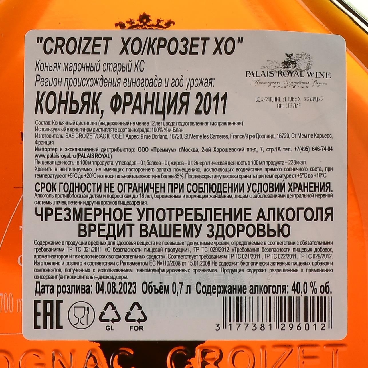 Коньяк Croizet XO 0,7 л — дорогостоящий французский миллезим, представленный виноградом урожая 2011 года. Белый сорт собрали спелым с лучших лоз департамента Шаранта и отправили на фабрику для обработки посредством сбраживания, двух циклов перегонки и выдержки продолжительностью как минимум двенадцать лет. Красивый декантер с напитком продается в картонном боксе, который декорирован необычным абстрактным орнаментом, объединяющим несколько оттенков. Это солидный вариант презента для того, кто разбирается в премиальном спиртном Франции.