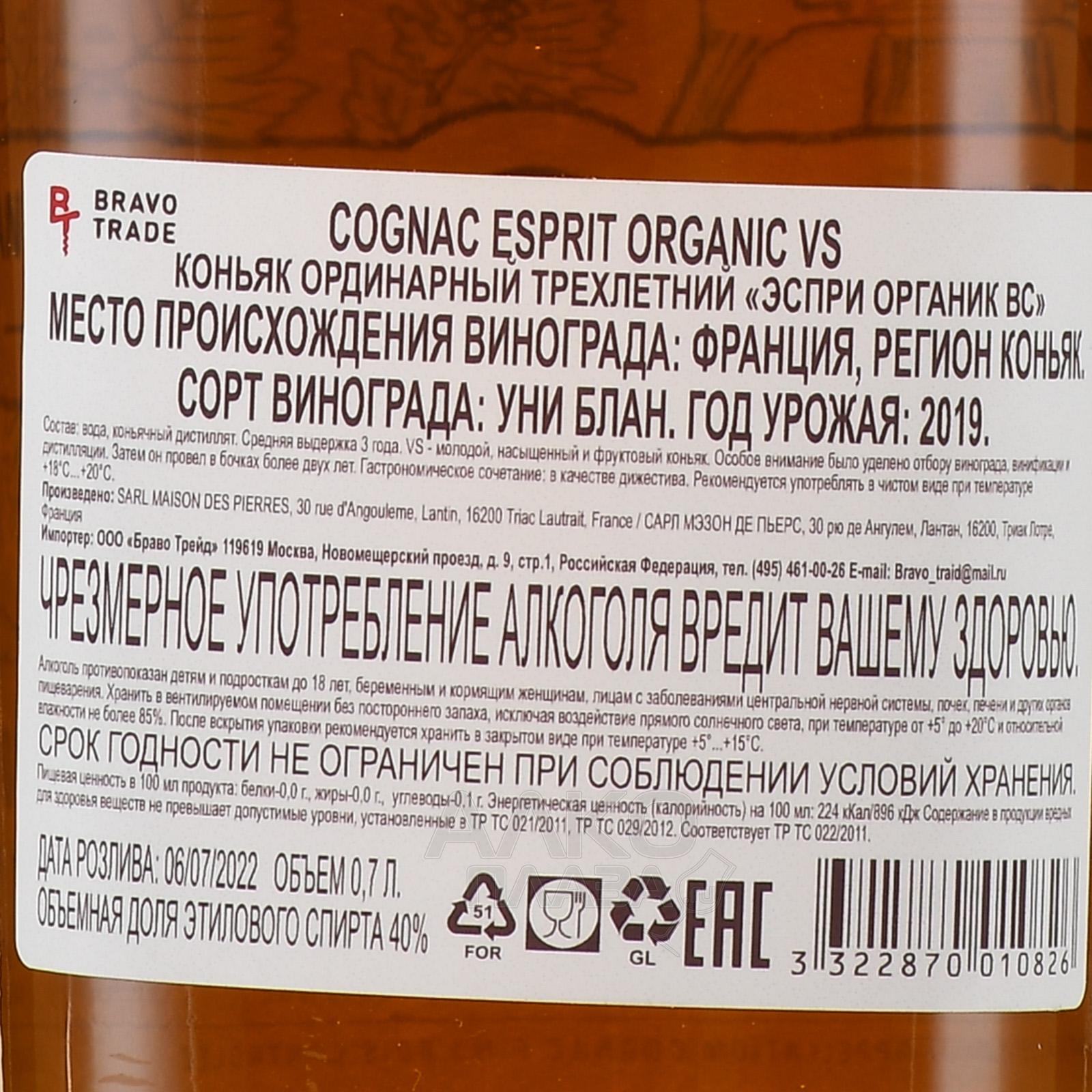 Коньяк Esprit Organic VS 0,7 л продается в светло-серой упаковке из матового картона. Сорокаградусный качественный алкоголь французской торговой марки содержит спирты белого автохтонного винограда с органических участков апелласьона Фин Буа (регион Коньяк), проведшие в дубовых бочонках от трех лет. Напиток — золотой призер знаменитого конкурса «San Francisco World Spirits Competition».