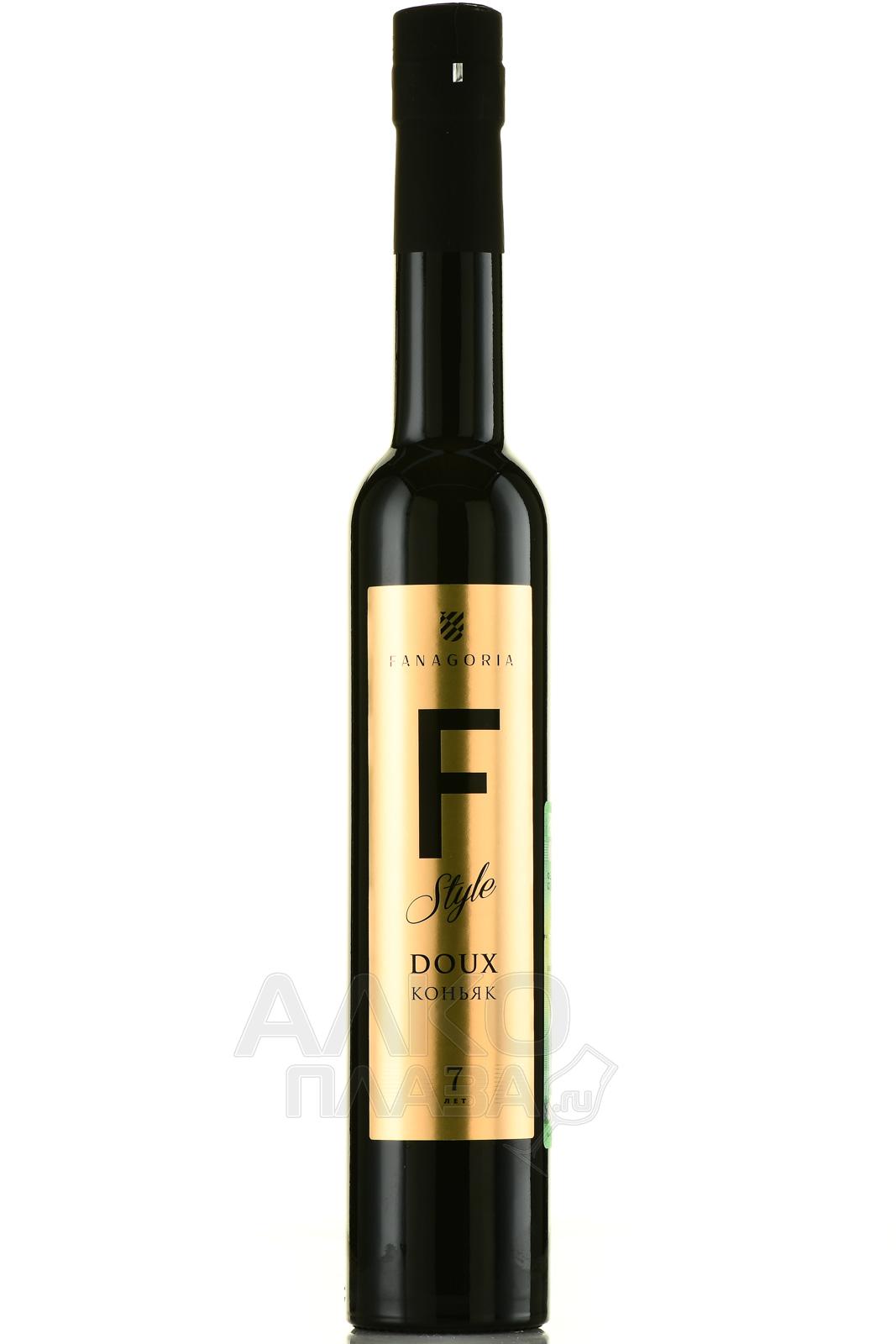 Коньяк F-style Doux 0,375 л, изготовленный на заводе популярной компании Фанагория, состоит из семилетних спиртов, прошедших вызревание в кавказских дубовых барриках столетнего возраста. Сырьем для напитка стали четыре сорта белого винограда с заповедных участков Таманского полуострова (Краснодарский край). Они подверглись алкогольному брожению и двойной перегонке в традиционных дистилляторах, и только после этого напиток разлили по деревянным бакам. Коньяк представлен в небольших темных бутылках продолговатой формы.