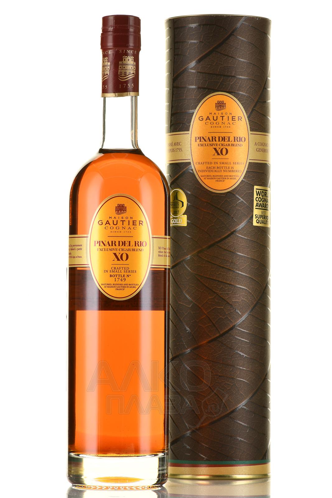 Коньяк Gautier XO Pinar Del Rio сопровождается подарочной коричневой тубой, подчеркивающей солидный статус напитка. Уровень спиртуозности чуть выше стандартного и равен 41,2%. Богатую вкусоароматику сформировали дистилляты французского винограда, выращенного в разных частях области Коньяк: Пти Шампань, Бордери, Гран Шампань и др. В составе присутствуют редкие спирты, созданные еще в XIX веке. Средний срок вызревания в лимузенских дубовых бочонках составил 7 лет.