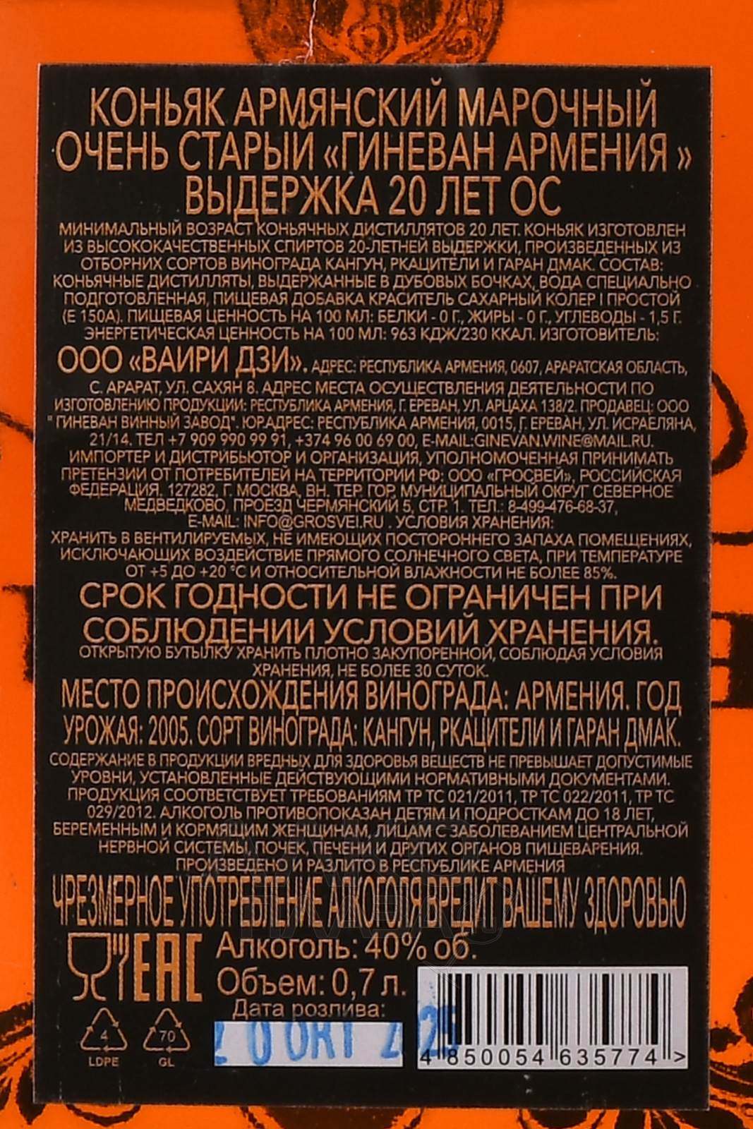 Ginevan XO 20 years - коньяк Гиневан ХО 20 лет 0.7 л в п/у