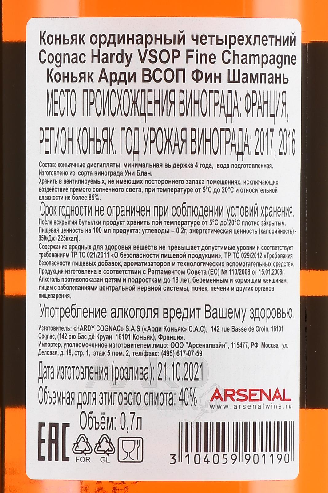 Коньяк Hardy VSOP Fine Champagne — элитный алкоголь из французского региона Cognac, объединивший в составе отборные виноградные спирты на основе сырья с плантаций областей Пти Шампань и Гран Шампань. Сорокаградусный напиток защищенного географического наименования был произведен посредством дистилляции с последующим вызреванием спиртов в бочонках из лимузенского дуба средней продолжительностью 8 лет. Коньяк реализуется в бутылках стандартного формата, идущих в паре с красивыми прямоугольными вытянутыми картонными коробками.