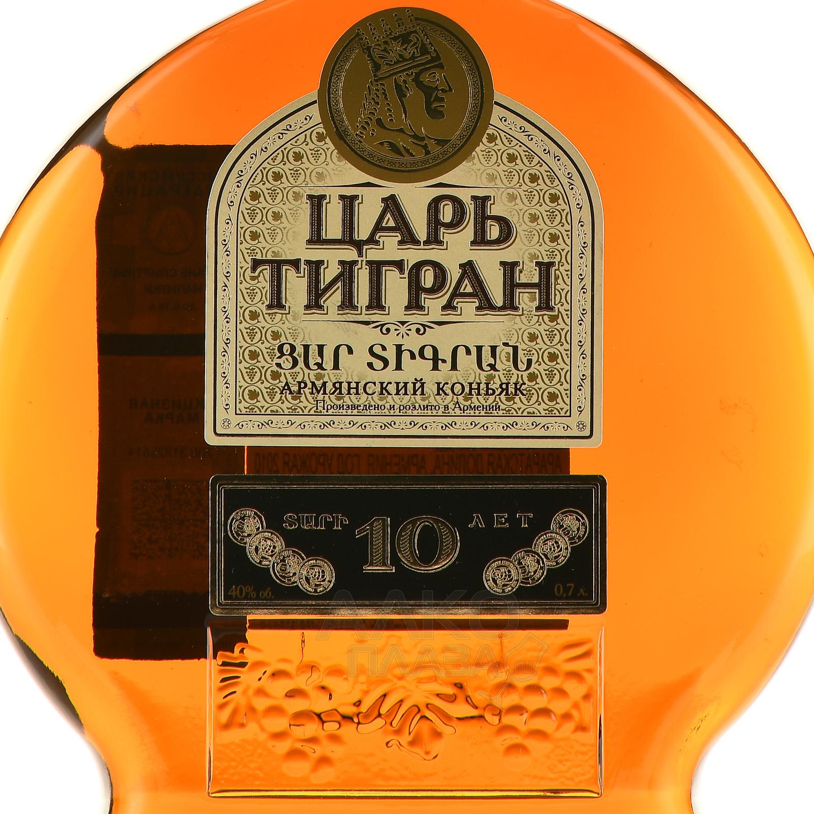 Коньяк Царь Тигран 10 лет 0.7 л в п/у + 2 бокала - замечательный армянский коньяк спирты которого выдержаны минимум 10 лет в бочках из кавказского дуба. Разлит в красивую плоскую бутылку объёмом 0,7 л и упакован в подарочную коробку с коньячными бокалами.