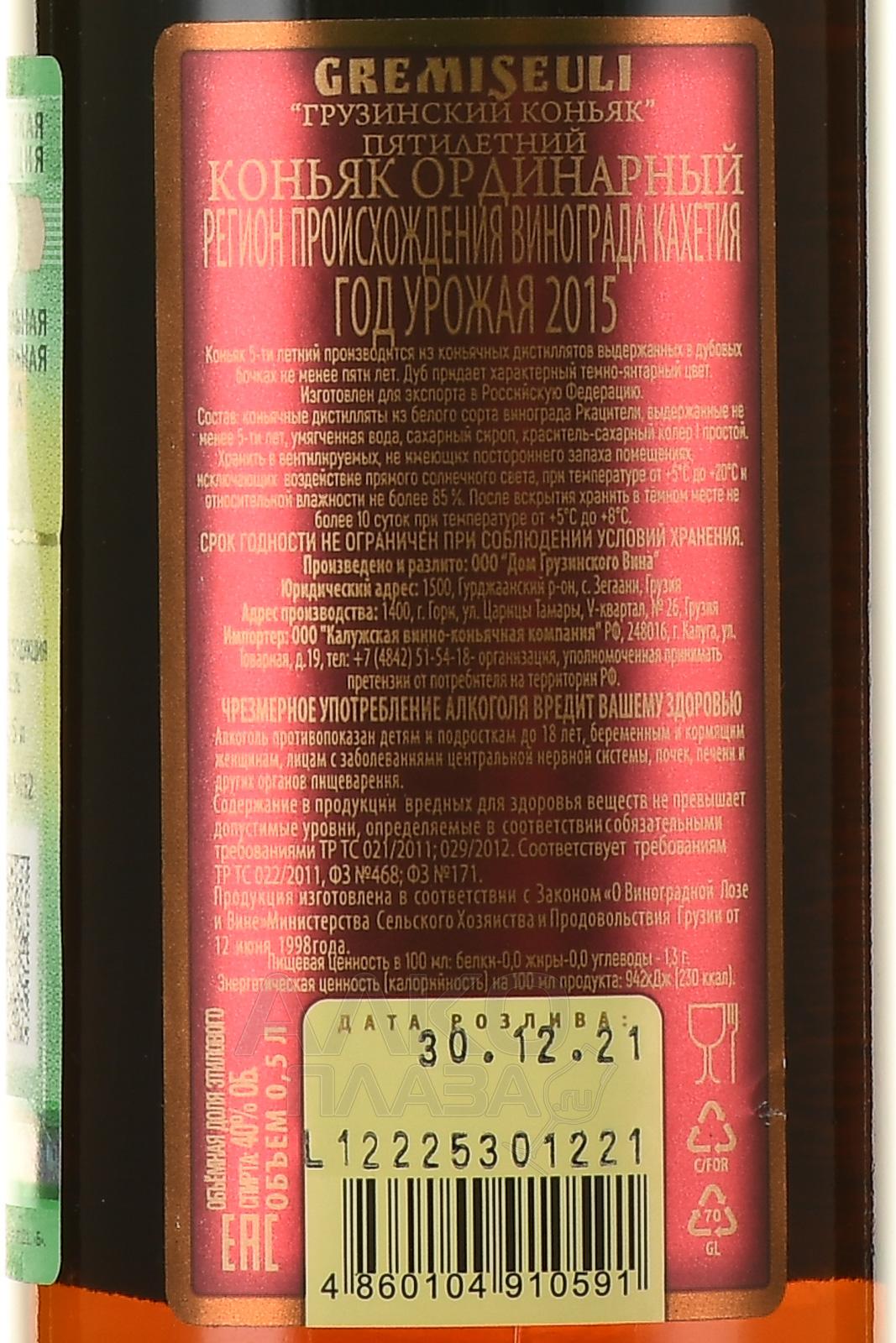 Коньяк Гремисеули Пятилетний — ординарный алкоголь грузинской торговой марки с натуральным составом, представленным спиртами одной виноградной вариации автохтонного типа, собранной в пределах Кахетии. Спелые ягоды были подвергнуты традиционной ферментации, а также двойной перегонке и выдержке в дубе сроком не менее 5 лет.