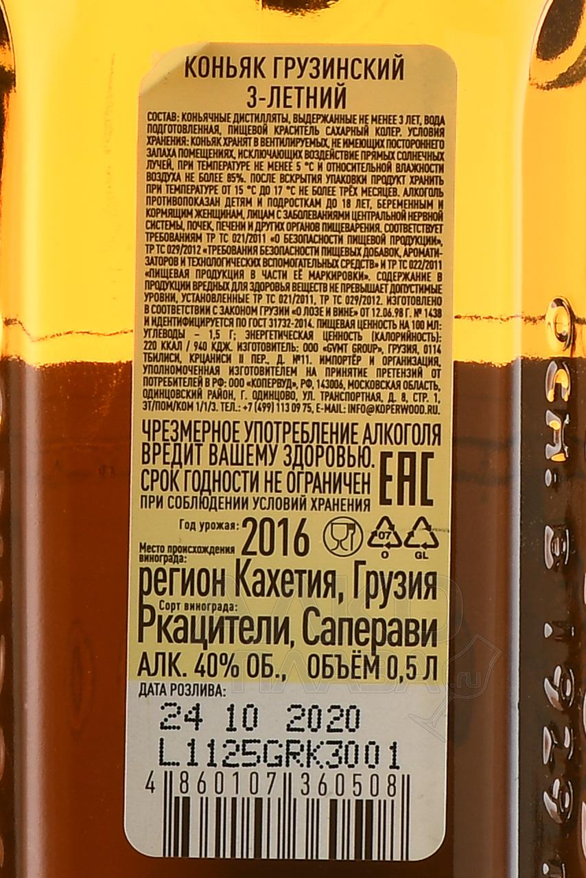 Коньяк Грузинский 3-летний создается по классической методике на территории области Кахетия, где также выращивается сырье для напитка — аборигенный виноград. Его собирают исключительно в спелом виде по достижении оптимальной сахаристости. В процессе обработки путем сбраживания, перегонки и трехлетнего вызревания в дубовых бочонках сорокапроцентный коньяк формирует богатый букет.