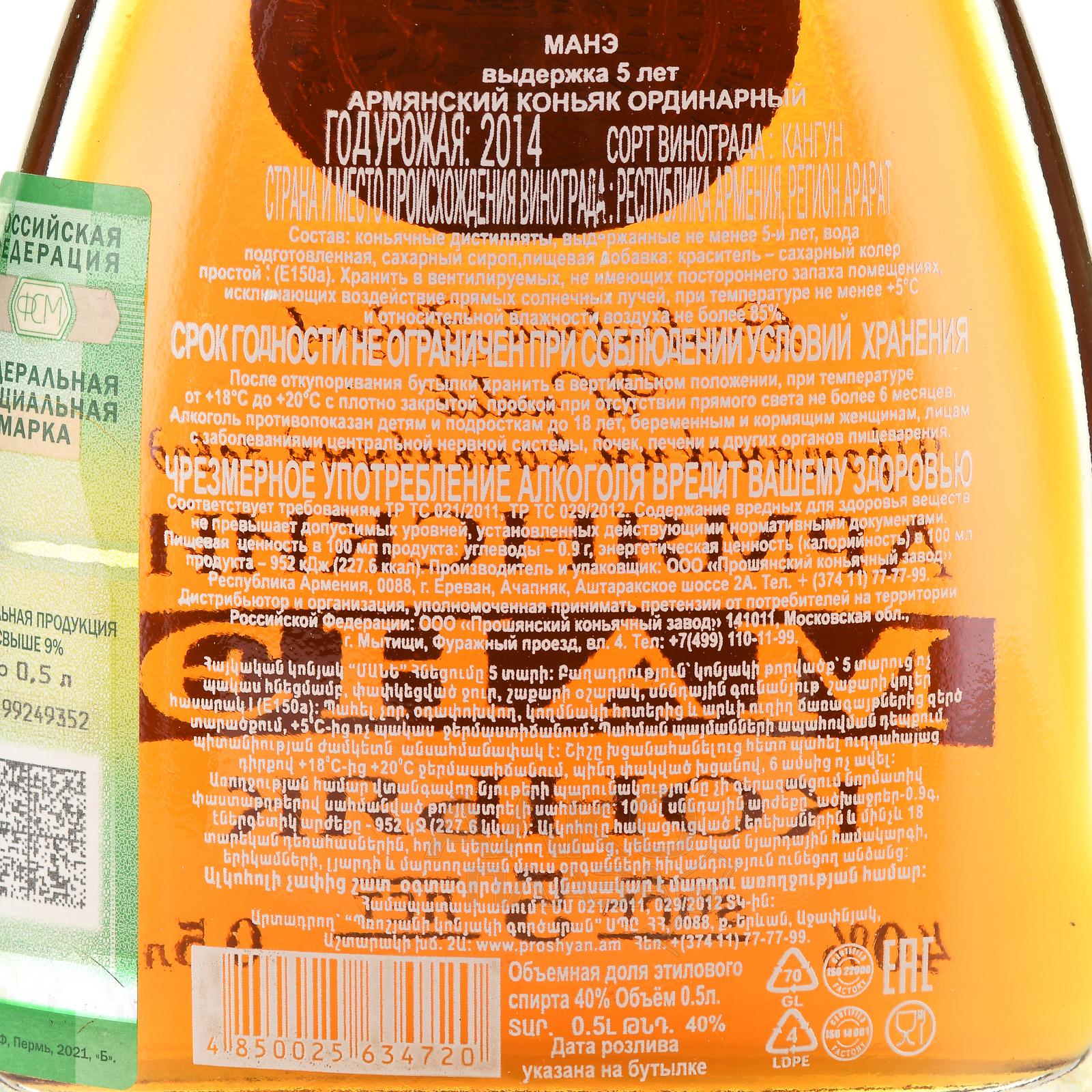 Коньяк Манэ 5 лет 0,5 л в п/у с 2 бокалами – универсальный сувенир, который можно вручить по случаю любого торжества. Ординарная вариация, купажированная из виноградных дистиллятов пятилетней бочковой выдержки, разлита в красивую бутылку. Элегантный дизайн емкости делает ее украшением для домашнего бара и праздничного стола.