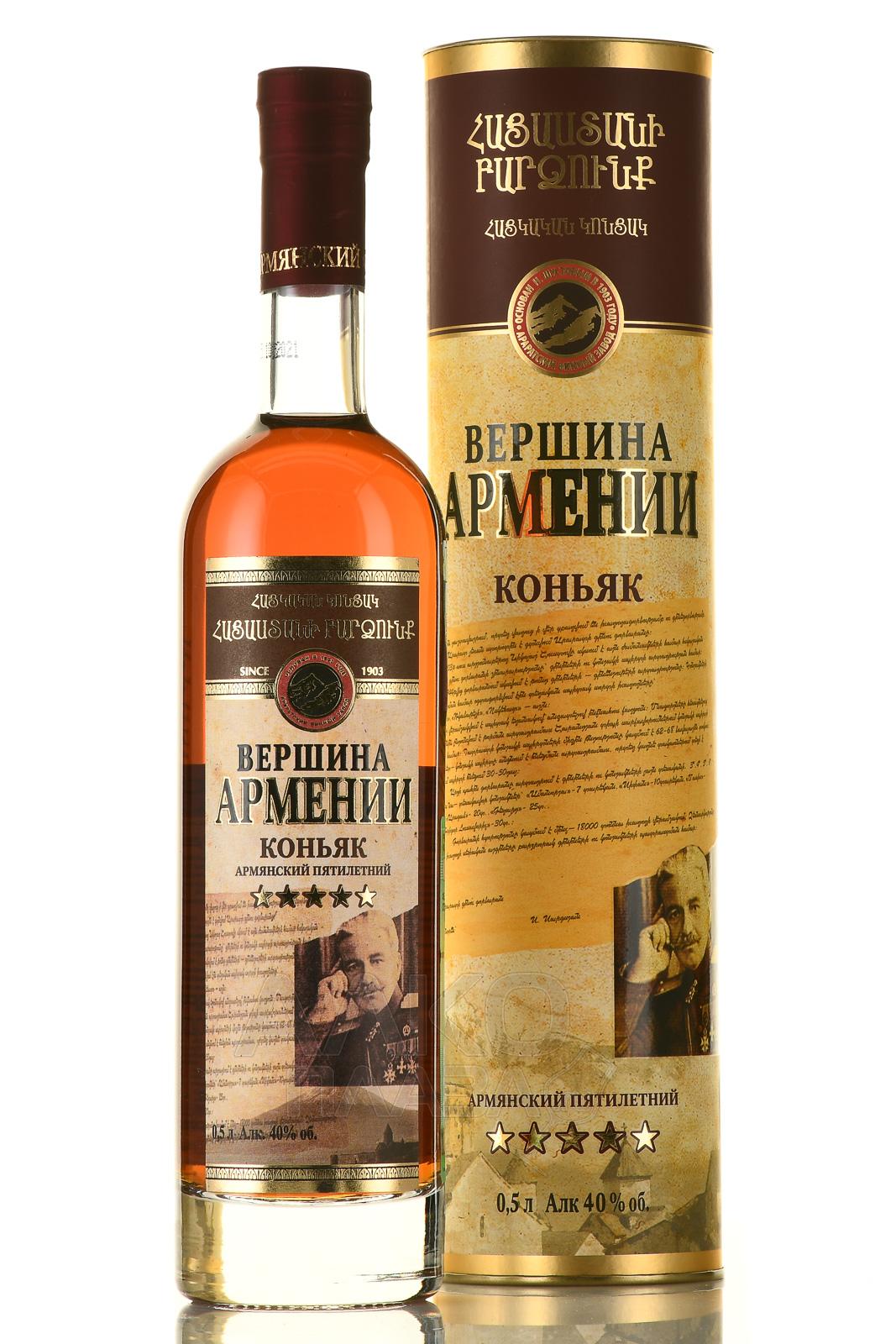 Коньяк Вершина Армении пятилетний 0.5 л в тубе — армянский алкоголь 5-летней выдержки, выпущенный в подарочной тубе. Сорта винограда из Араратской долины были выращены под теплым солнцем Армении. Коньячные дистилляты выли выдержаны в бочках из древесины кавказского дуба. В создании коньяка Араратским коньячным заводом применялись исконные национальные технологии. Это отличный подарок к 5-летию супружеской жизни — деревянной свадьбе.