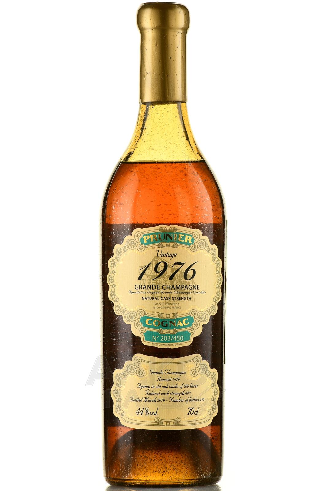 Коньяк Prunier Grande Champagne Vintage 1976 год 0,7 л в деревянной упаковке подарочного вида (солидном прямоугольном боксе) объединяет в составе зрелые виноградные дистилляты французского производства. Их изготовили по технологии перегонки из премиального урожая зоны Гран Шампань (регион Коньяк, провинция Гасконь) с применением дальнейшей выдержки в дубовых бочонках — в них напиток класса «элит» находился не менее тридцати лет. Розлив по бутылкам выполнили в апреле 2019 года. Крепость спиртного немного выше стандарта — 44 процента.