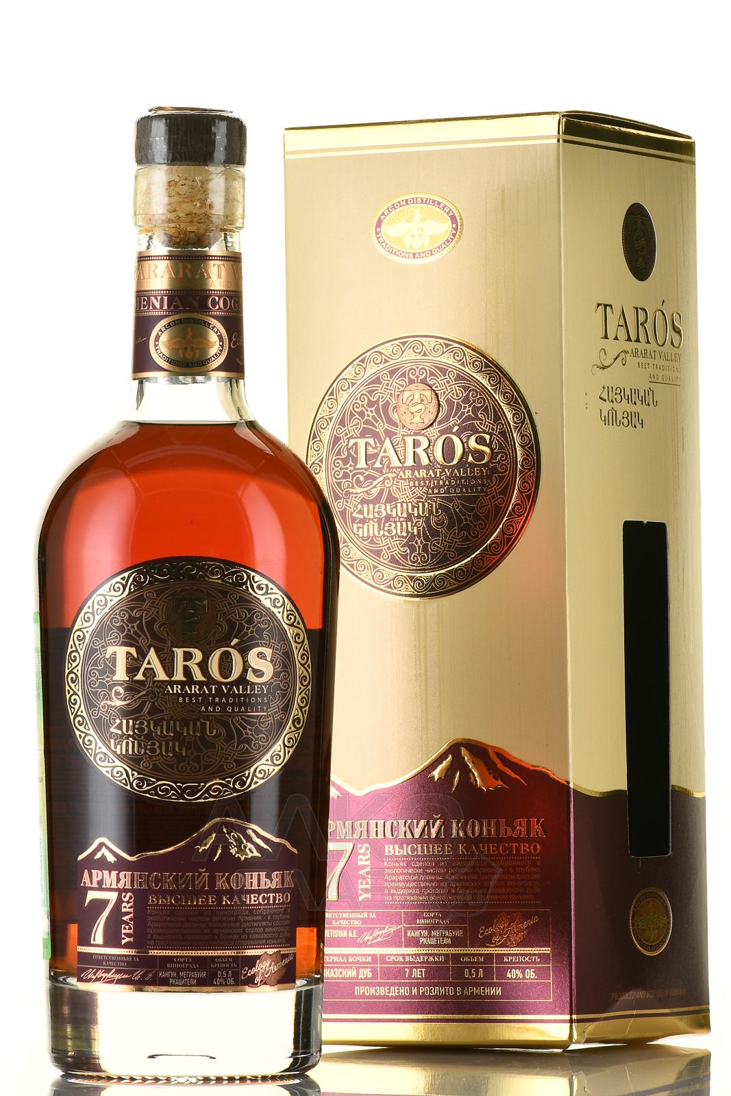 Коньяк КВ Тарос 7 лет 40% 0,5 л – традиционный армянский напиток 7-летней выдержки славится тем, что при его изготовлении производитель использует исконно армянские технологии коньячного мастерства, при этом производство оснащено модернизированным оборудованием. Опытный коллектив профессионалов создает напиток из винограда, выращенного в Араратской долине, из которого добывают коньячный спирт посредством двойной перегонки сусла, после чего напиток настаивают в дубовых бочках на протяжении трех лет.