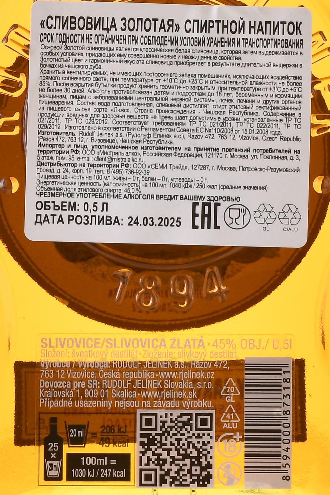 R. Jelinek Slivovitsa Gold 3 years - бренди Рудольф Елинек Сливовица Золотая 3 года 0.5 л
