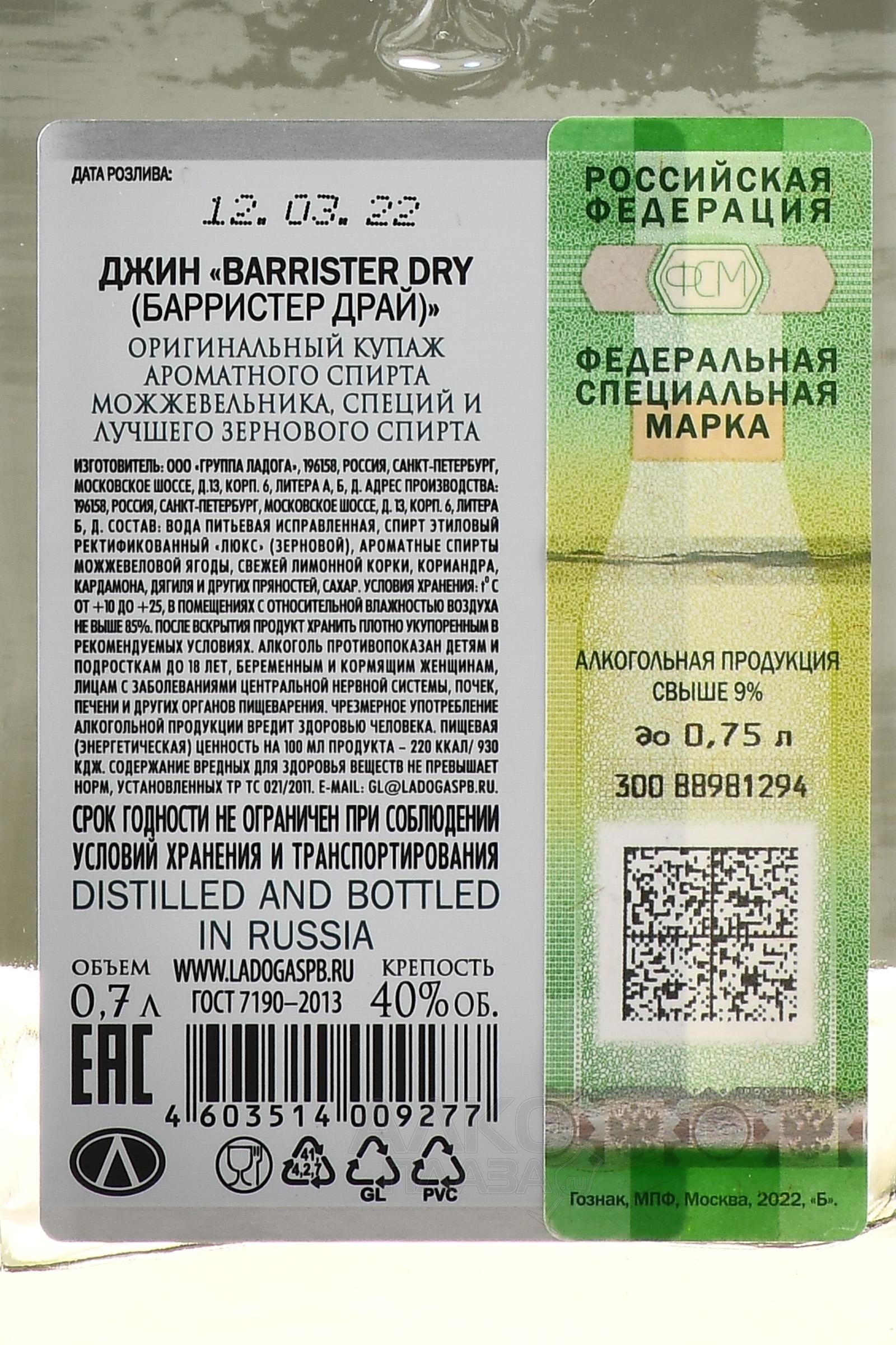 Barrister Dry джин приготовлен по всем канонам и ингредиентам, изюменкой является присутствие мускатного ореха, который делает напиток более деликатным. Прекрасен во всех коктейлях на основе джина и с тоником.