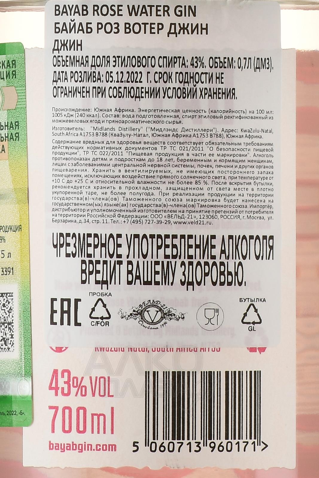 Джин Bayab Rose Water 0,7 л — оригинальный сорт с розовой водой, произведенный дистиллерией в южноафриканском регионе Мидлендс. Он относится к категории крафтовых, но его качество соответствует мировому уровню. Алкоголь создается с применением ручного труда маленькими партиями и имеет эксклюзивную рецептуру, которая не разглашается. Известно, что производитель использует в качестве базового компонента спирт-ректификат из сахарного тростника с плантаций ЮАР. Также в состав входят можжевеловые ягоды, плоды баобаба, розовая вода, лепестки африканской розы, морская соль и композиция из специй. Смесь ингредиентов настаивается на спирте, затем следует этап медленной дистилляции в медных кубах. До крепости 43% джин разбавляется родниковой водой.