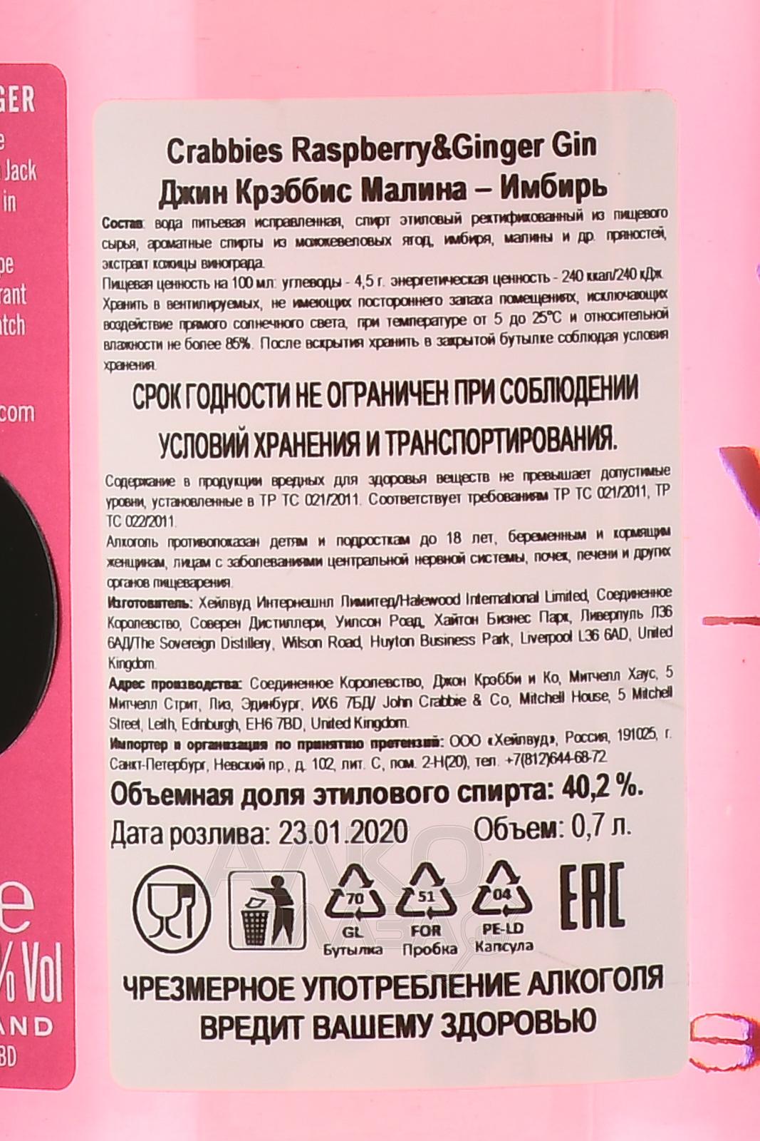 Джин Crabbie`s Raspberry Ginger — качественный напиток из Великобритании с натуральным составом, ключевыми компонентами которого являются настои спелой малины и имбирного корня. Вместе с другими составляющими (ягодами можжевельника, виноградом, специями) они настаиваются на нейтральном зерновом ректификате и проходят перегонку, после чего продукт разбавляется небольшим количеством родниковой воды для снижения крепости до 40,2 градуса.