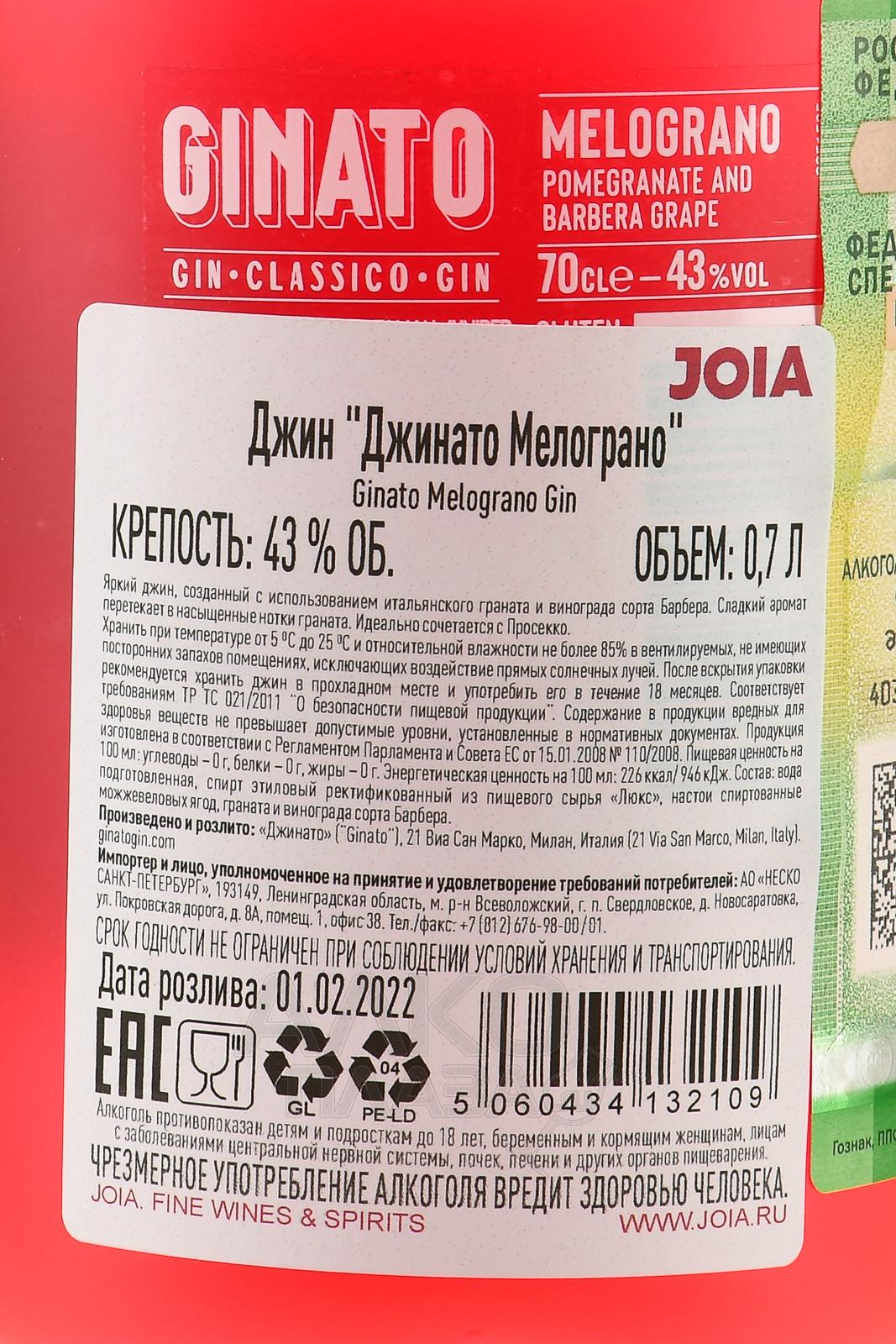 Джин Ginato Melograno 0,7 л — премиальный алкоголь из Великобритании, крепость которого чуть превышает стандартную отметку и составляет 43 градуса. Многогранный вкус напитка сформировали натуральные ингредиенты: тосканский можжевельник, виноград Барбера, гранатовые зерна. Изготовление прошло путем мацерации и перегонки. Джин выпустили ограниченным тиражом в непрозрачных бутылках с запоминающимся дизайном.