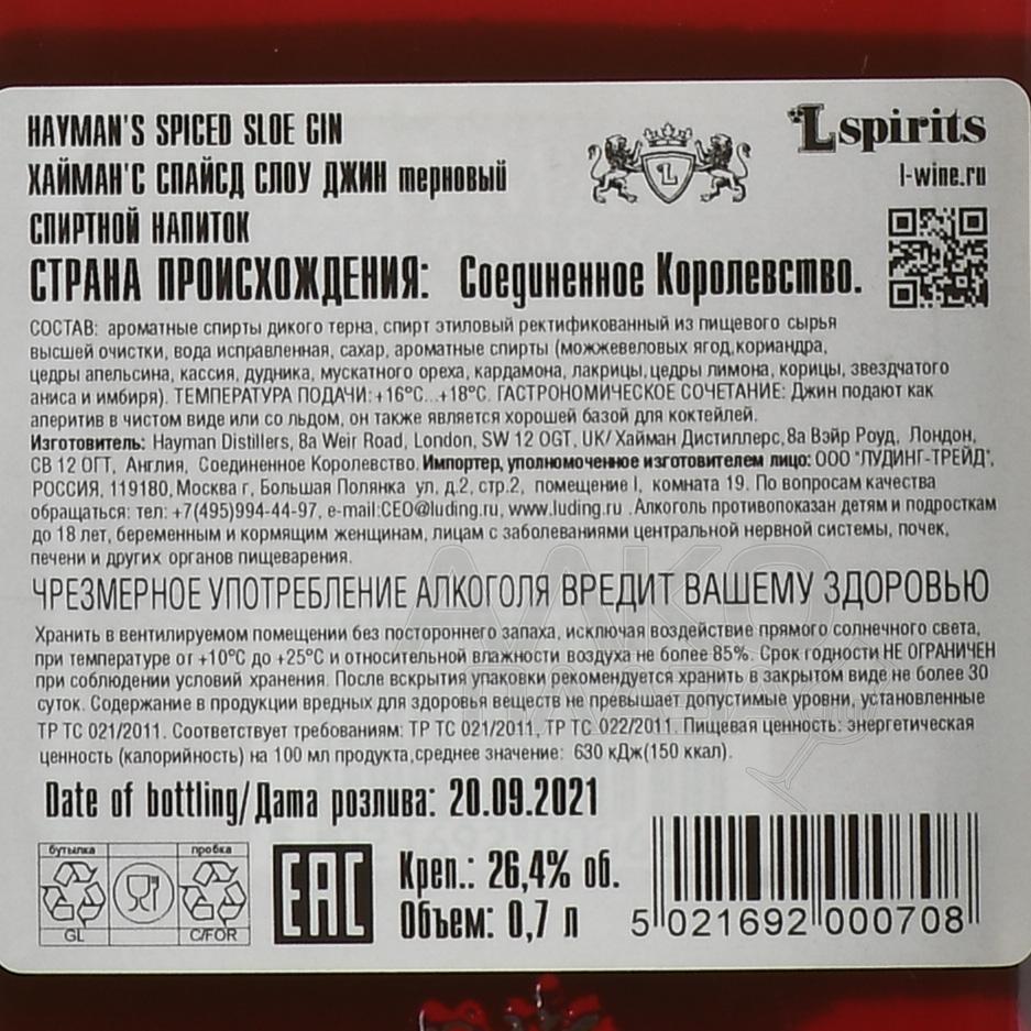 Джин Haymans Spiced Sloe Gin 0.7 л — ароматный немного сладковатый терновый джин Великобритании, который объединяет в своем составе такие специи, как корица, мускатный орех, кардамон, имбирь и звездчатый анис. На создание пряного джина производителя вдохновила ярмарка, которая проводится на Рождественский сочельник, когда горячий джин подавали с пряным печеньем. Его можно употреблять с игристым вином и ароматным печеньем и в чистом виде в качестве согревающего напитка в зимние вечера.