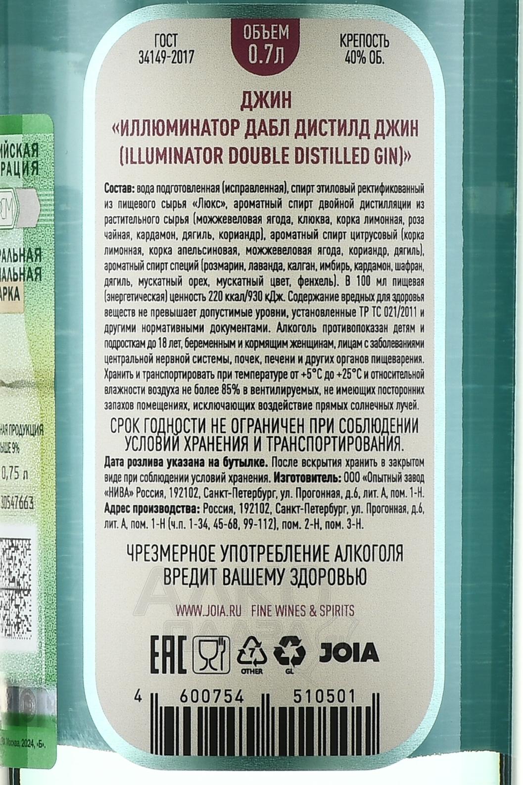 Джин Illuminator Double Distilled 0,7 л — качественный российский напиток сорокаградусной крепости, изготовленный в лучших традициях алкогольного искусства Великобритании. Его произвели на передовом оборудовании предприятия из города Санкт-Петербурга в соответствии с требованиями ГОСТ. Душистые ингредиенты, выбранные в строгих пропорциях для получения богатого, но не приторного вкуса (например, ягоды можжевельника, лимонная цедра, кориандр, дягиль, мускатный орех, кардамон), вымачивались в спирте класса «Люкс», затем джин два раза перегнали и отфильтровали. Для снижения крепости в него добавили немного воды из артезианского источника.