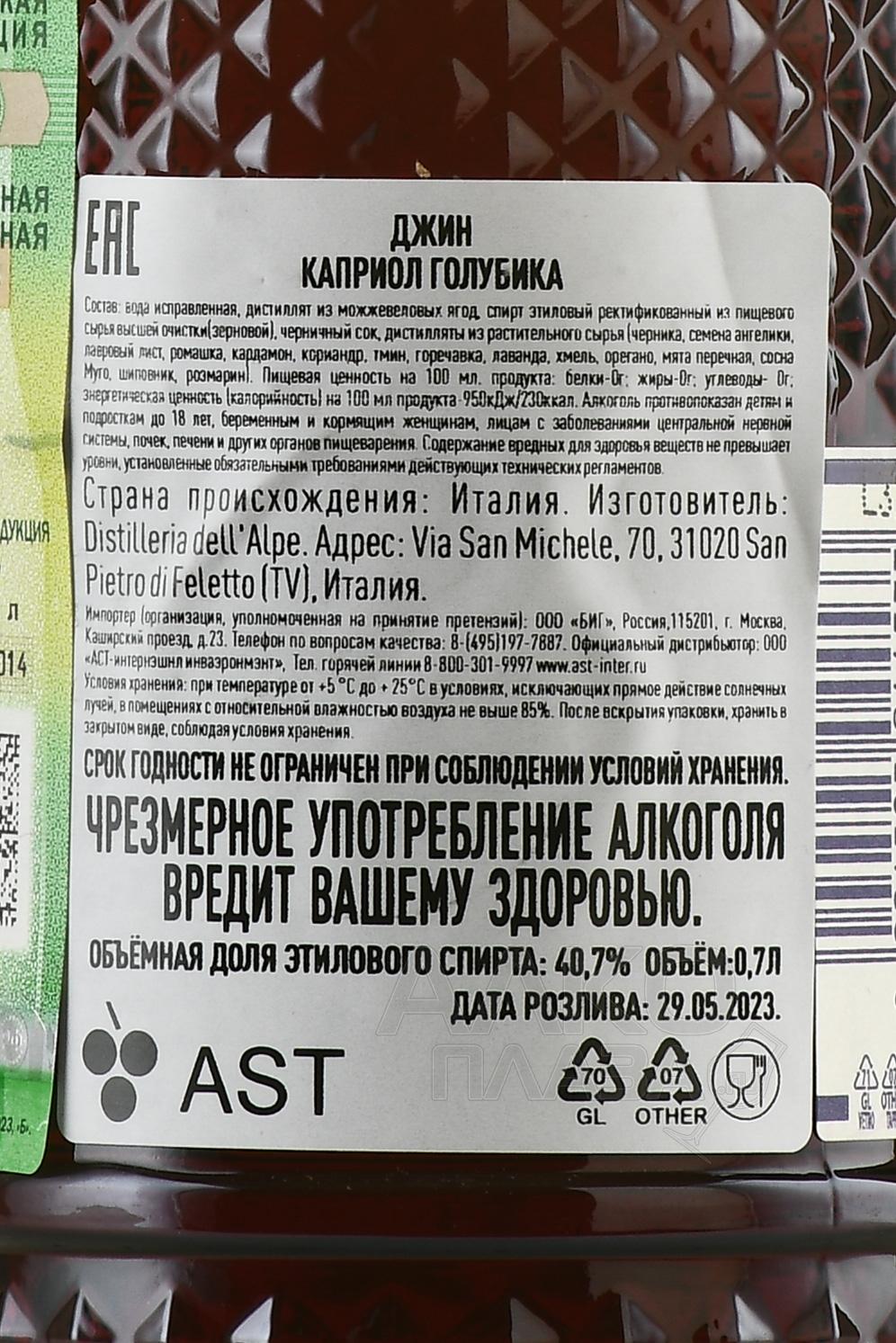 Джин Kapriol Blueberry 0,7 л – необычный алкоголь из Италии, в котором сочетаются классическая и средиземноморская традиции. В наборе ингредиентов для производства есть как традиционные (можжевельник, кардамон, кориандр, ангелика и т.п.), так и оригинальные (лаванда, орегано, розмарин, горечавка, ромашка). В основе рецепта лежит прошлое прошлое столетие, в котором приготовлены ликеры из горных трав, собранные в итальянских альпах. Он был доработан и улучшен. В сухой джин, в отличие от ликера, не добавляется сахар. При этом используется натуральный черничный сок и дистиллированные ягоды черники, за счет чего создается уникальная вкусовая палитра. Алкоголь относится к категории ремесленных и создается с применением ручного труда. Для перегонки применяются 2 медных 100-литровых куба, сделанных в 1947 году Антонио Падованом. Часть компонентов дистиллируют холодным способом, чтобы сохранить мельчайшие составляющие аромата. Джин проходит легкую фильтрацию и бутилируется при крепости 40,7%.