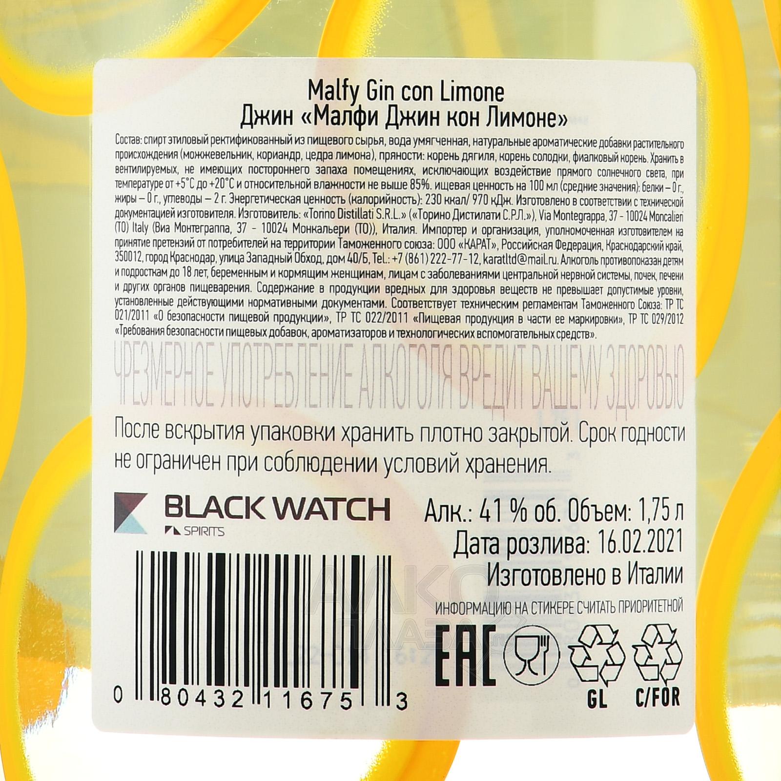 Джин Malfy Con Limone 1,75 л выпущен итальянской компанией в бутылке повышенного типа объема, которая является идеальным вариантом для большого праздника. Характерный пикантный вкусоаромат 41-градусного алкоголя сформировался благодаря применению строгого соотношения компонентов натурального происхождения: лимонов с побережья Амальфи, экстрактов трав, грейпфрута, кориандра, солодки и ягод можжевельника. Все эти ингредиенты вымачивались в зерновом дистилляте, перед розливом провели фильтрацию.