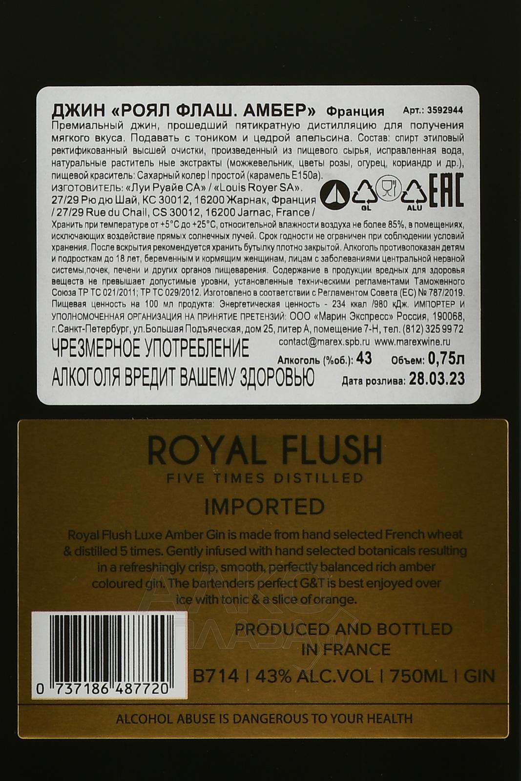 Джин Royal Flush Amber 0,75 л — премиальный янтарный сорт, созданный по эксклюзивной рецептуре и классической технологии во французской провинции Коньяк. Основной является спирт из сортовой пшеницы. Применялась 5-кратная дистилляция, чтобы вкус алкголя был как можно более мягким и гладким. Были использованы 12 растительных компонентов, которые отбирали вручную. Среди них можжевельник, кориандр, лепестки розы, огурец и т. п. Джин подкрашивается карамелью и разбавляется водой из природных источников региона Шаранта до крепости 43%.