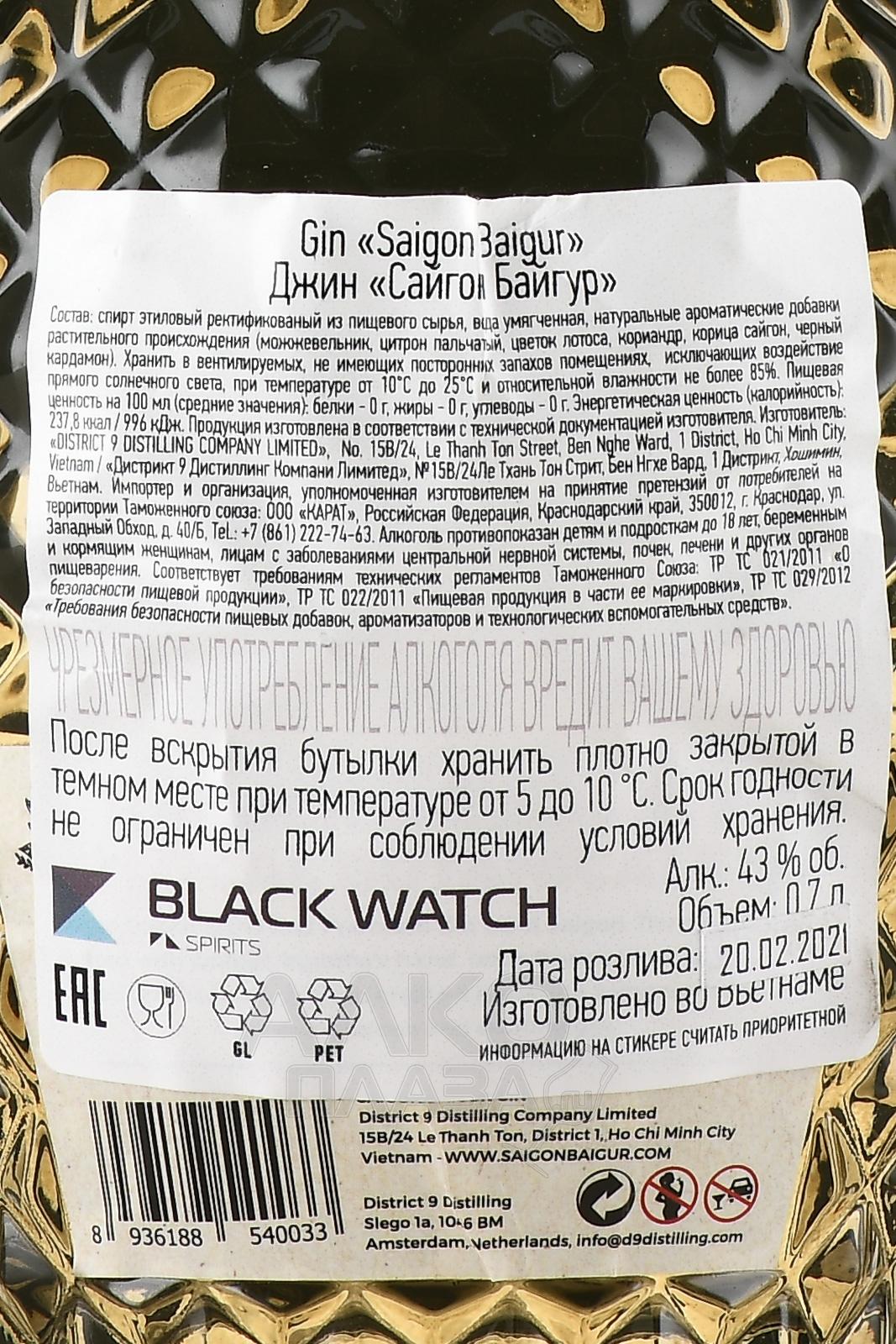 Джин Saigon Baigur 0,7 л — премиальный алкоголь из Вьетнама, который имеет крафтовый статус и создается небольшими партиями с применением ручного труда. Его название перекликается с историей крупного города Хошимин, где находится дистиллерия. Второе название этого населенного пункта — Сайгон. Более 1000 лет назад на его месте располагалось поселение Байгур. Для напитка использовались 12 ботаникалов, которые поступают из разных уголков Вьетнама, и 4 ингредиента классического джина. Ключевую роль играет растение под названием «Ладони Будды» - цитрон пальчатый. Также в составе присутствуют можжевельник из Македонии, цветки лотоса, сайгонская корица, бадьян, дягиль, кориандр, перец и др. Каждый компонент настаивается на спирте и затем дистиллируется в медном кубе под присмотром мастера. В конце составляется купаж, рецептура которого совершенствовалась почти 5 лет. Крепость сухого джина составляет 43%. Он разливается в дизайнерскую бутылку, напоминающую по форме драконье яйцо.